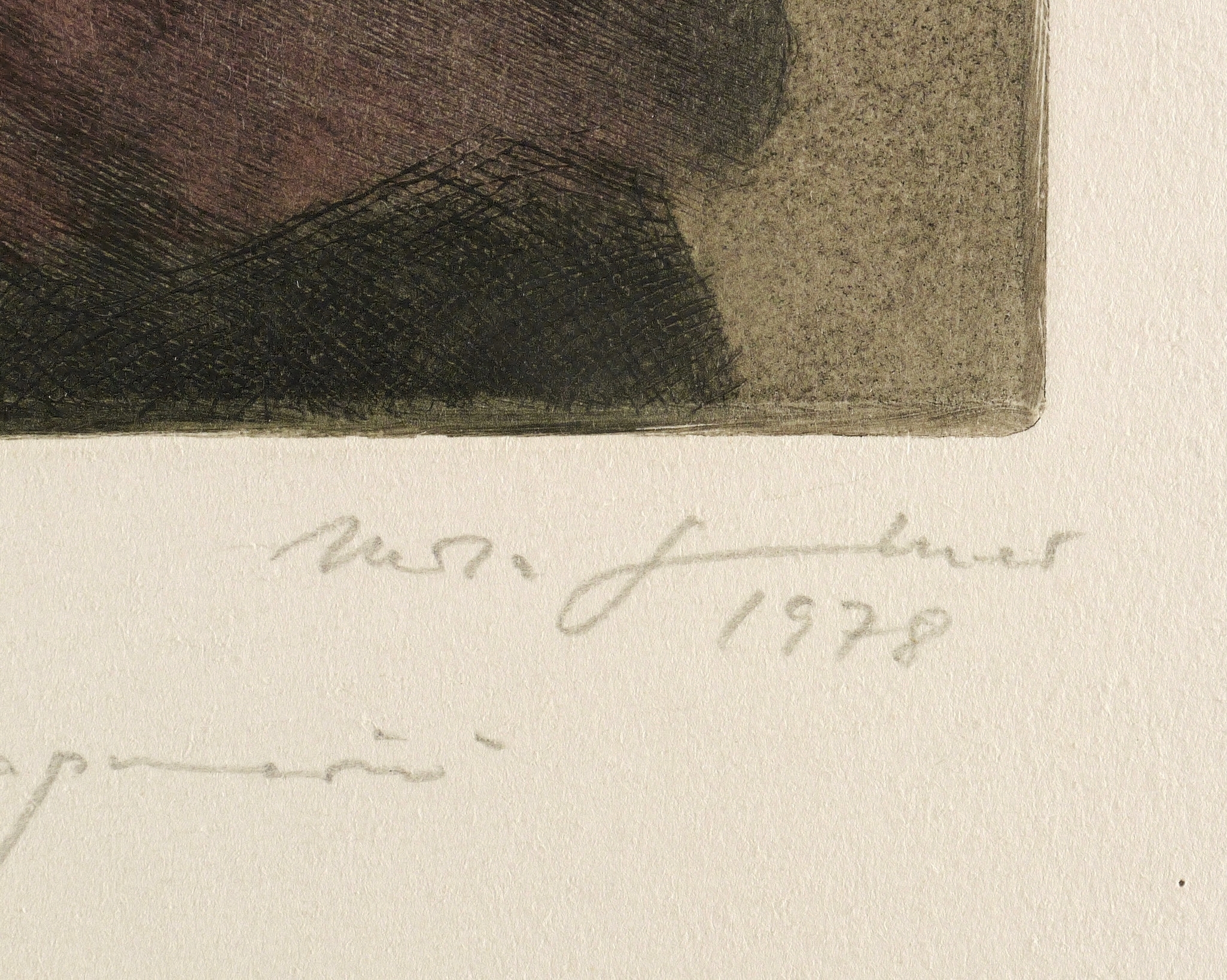 1978. Farbradierung / Aquatinta & Kaltnadel, in Ocker, Violett & Schwarz, auf schwerem hellem Hahnemühle. – Originale Künstlergrafik, von Herta Günther. – Auflage Exemplar Nr. 11/20. – 13,4 x 12,3 cm (Darstellung / Platte), 27 x 22 cm (Blatt).