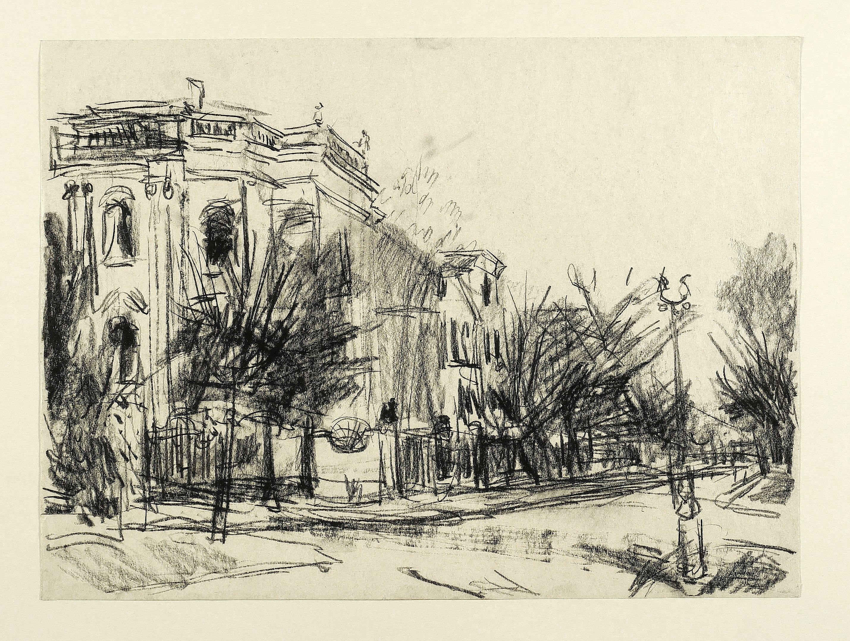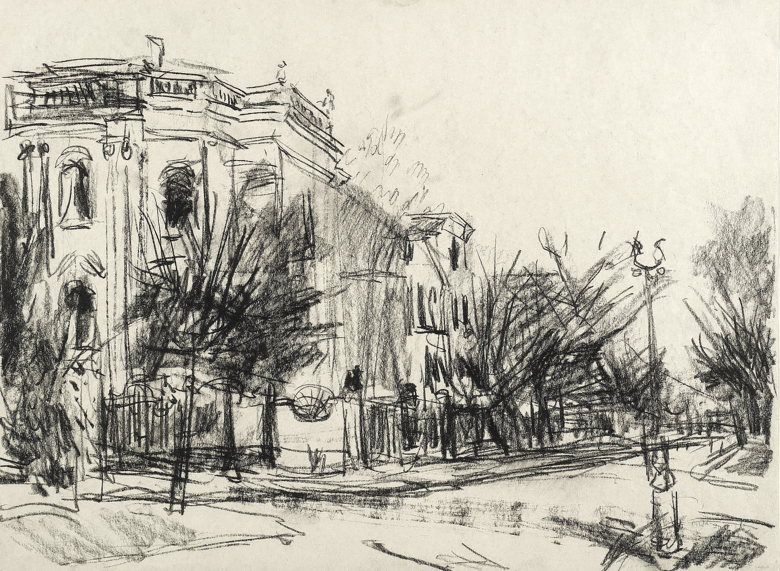 1959. Zeichnung / Graphit & Kohle, auf gelblichem Papier. – Originale Künstlergrafik, von Ernst Hassebrauk. – Unikat. – 29,4 x 39,7 cm (Darstellung / Blatt).