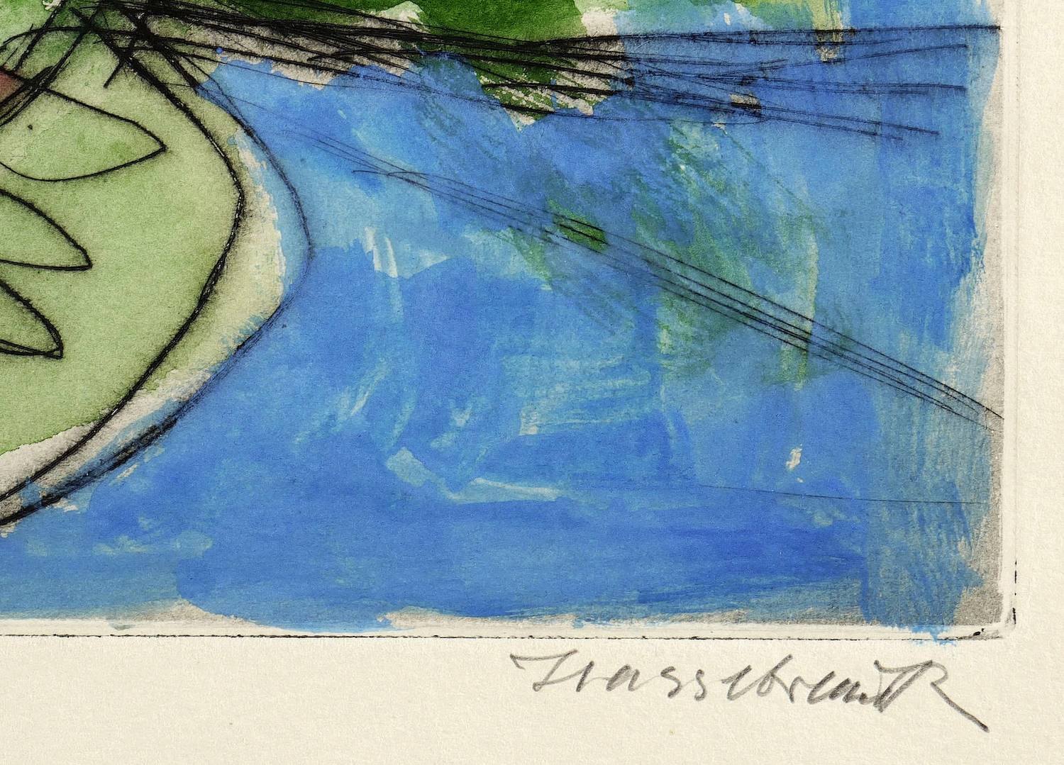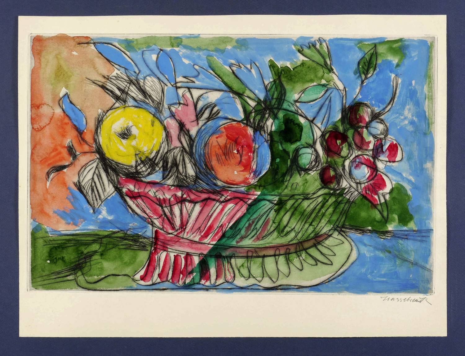 1968. Aquarell, über Kaltnadelradierung, auf Kupferdruckkarton. – Originale Künstlergrafik, von Ernst Hassebrauk. – Unikat. – 30,4 x 47,8 cm (Darstellung / Platte), 38 x 50 cm (Blatt).
