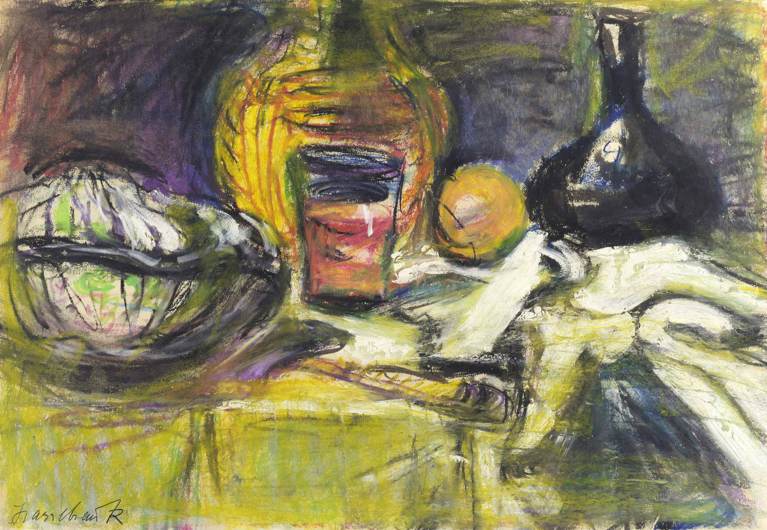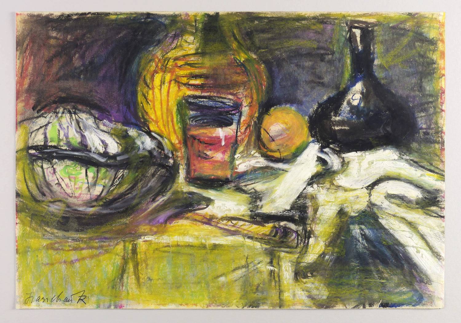Links unten in schwarzer Kreide signiert: ″hassebrauk″. Verso eigenhändig in Bleistift bezeichnet: ″(Alt-ital. Stilleben) / Für Herrn Prof. herzlich von Ernst Hassebrauk / Oktober 1965″. – Schönes dicht gearbeitetes Blatt! – Das Deckweiß partiell etwas brüchig. Rückseitig im Rand umlaufend leichte Montagespuren. Insgesamt guter Zustand.