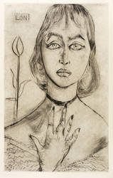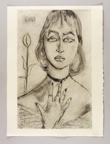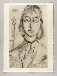 Lau 184. – Verso in Bleistift von Charlotte Hassebrauk authorisiert: ″p.m. Ernst Hassebrauk″. Weiter original betitelt: ″Loni mit Tulpe″. Dazu Auflagenbezeichnung. Wasserzeichen. – Posthumer Abzug von der originalen Platte für die Mappe ″Ernst Hassebrauk. Frauenbildnisse″, die 1985 von der Witwe Charlotte Hassebrauk als Edition der eikon Grafik-Presse im Verlag der Kunst Dresden in einer Gesamtauflage von 35 Exemplaren erschien. – Sehr guter Zustand.