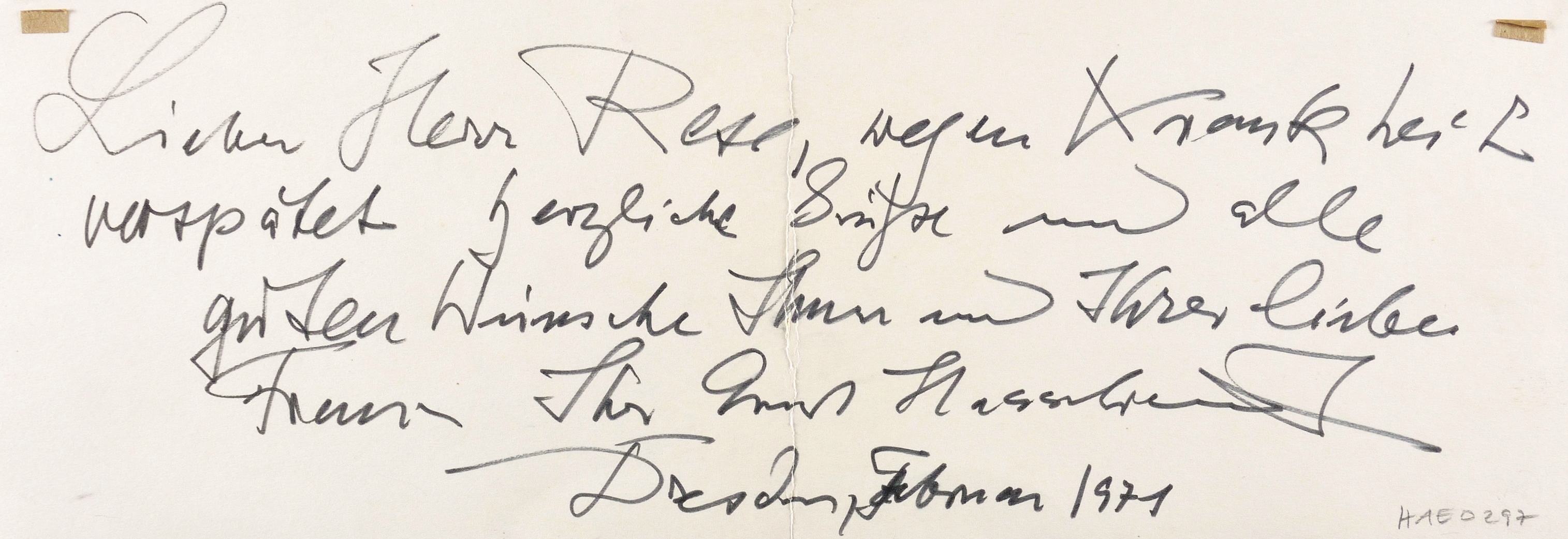 Verso Widmung. Mit Faserstift signiert: ″Ernst Hassebrauk Dresden, Februar 1971″. – Mittig weitgehend ausgelegene vertikale Klappfalte. Guter Zustand.