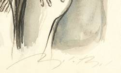 Um 2000. Zeichnung / Tusche & Aquarell, über Fettkreide, auf hellchamois Velin. – Originale Künstlergrafik, von Angela Hampel. – Unikat. – 23,5 x 19,0 cm (Darstellung), 26,5 x 22,5 cm (Blatt).