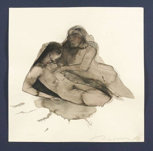 Angela Hampel (*1956 Räckelwitz, lebt und arbeitet in Dresden). Deutsche Malerin und Grafikerin. Lehre und Arbeit als Forstfacharbeiterin. 1977-82 Studium an der HfBK Dresden bei Jutta Damme und D. Büttner. Danach freischaffend. Mitbegründerin der Dresdner Sezession '89. Zahlreiche Einzelausstellungen u.a. in der Galerie Döbele. In ihren Figuren einen sich das Weibliche und das Männliche, das Menschliche und das Tierische, kämpfen gegen einander oder um einander - vital, agressiv und zärtlich zugleich.
