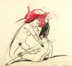Angela Hampel (*1956 Räckelwitz, lebt und arbeitet in Dresden). Deutsche Malerin und Grafikerin. Lehre und Arbeit als Forstfacharbeiterin. 1977-82 Studium an der HfBK Dresden bei Jutta Damme und D. Büttner. Danach freischaffend. Mitbegründerin der Dresdner Sezession '89. Zahlreiche Einzelausstellungen u.a. in der Galerie Döbele. In ihren Figuren einen sich das Weibliche und das Männliche, das Menschliche und das Tierische, kämpfen gegen einander oder um einander - vital, agressiv und zärtlich zugleich.