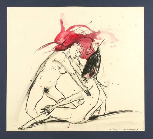 Um 2000. Zeichnung / Fettkreide & Aquarell, partiell gewischt, in Schwarz und Rot. – Originale Künstlergrafik, von Angela Hampel. – Unikat. – 36,5 x 40,5 cm (Darstellung / Blatt).