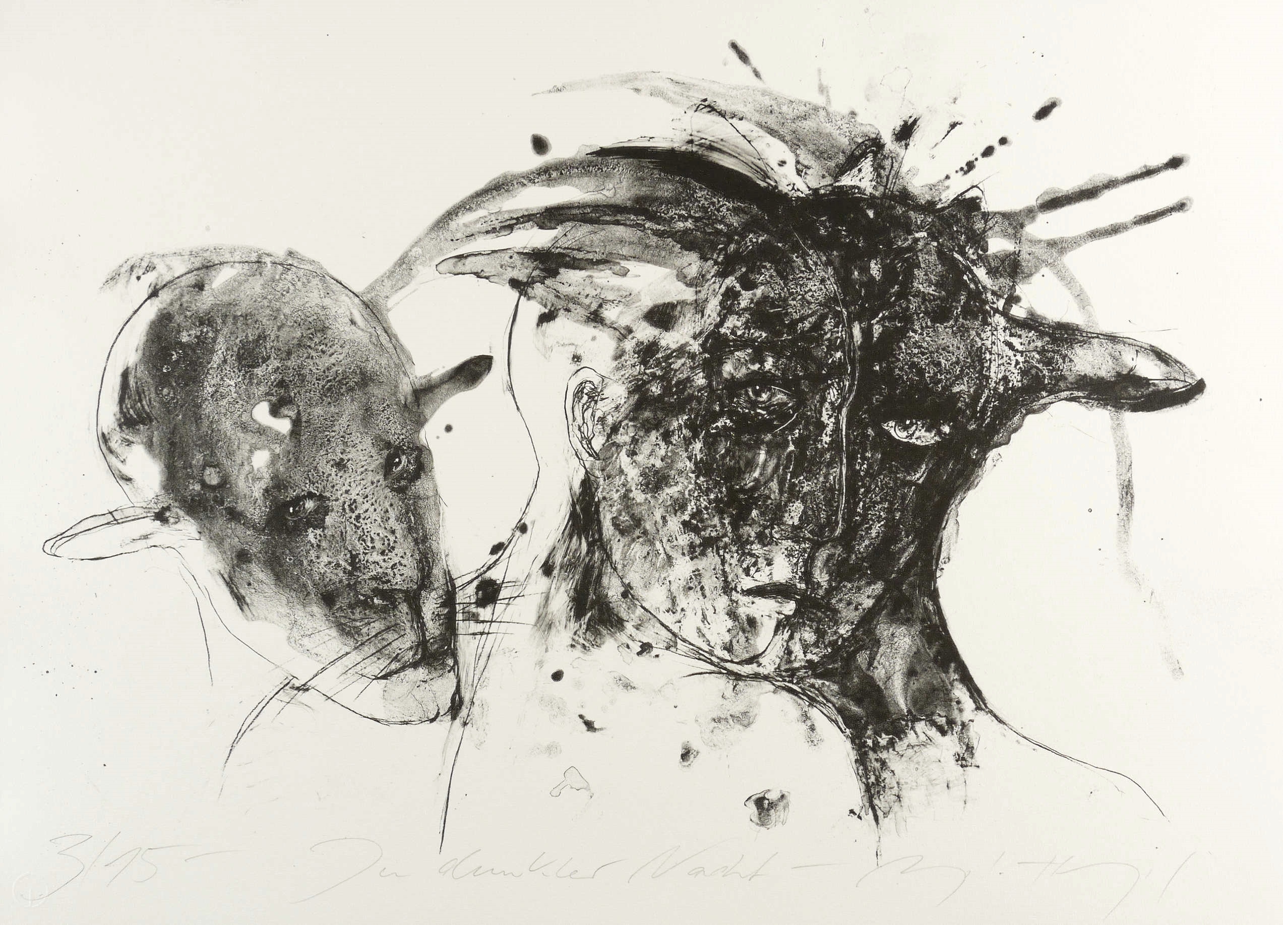 2017/2018. Algrafie / Kreide- & Pinselalgrafie, in Schwarz, auf Hahnemühle-Bütten. – Originale Künstlergrafik, von Angela Hampel. – Auflage Exemplar Nr. 3/15. – 45,0 x 63,0 cm (Darstellung), 50,0 x 70,5 cm (Blatt).