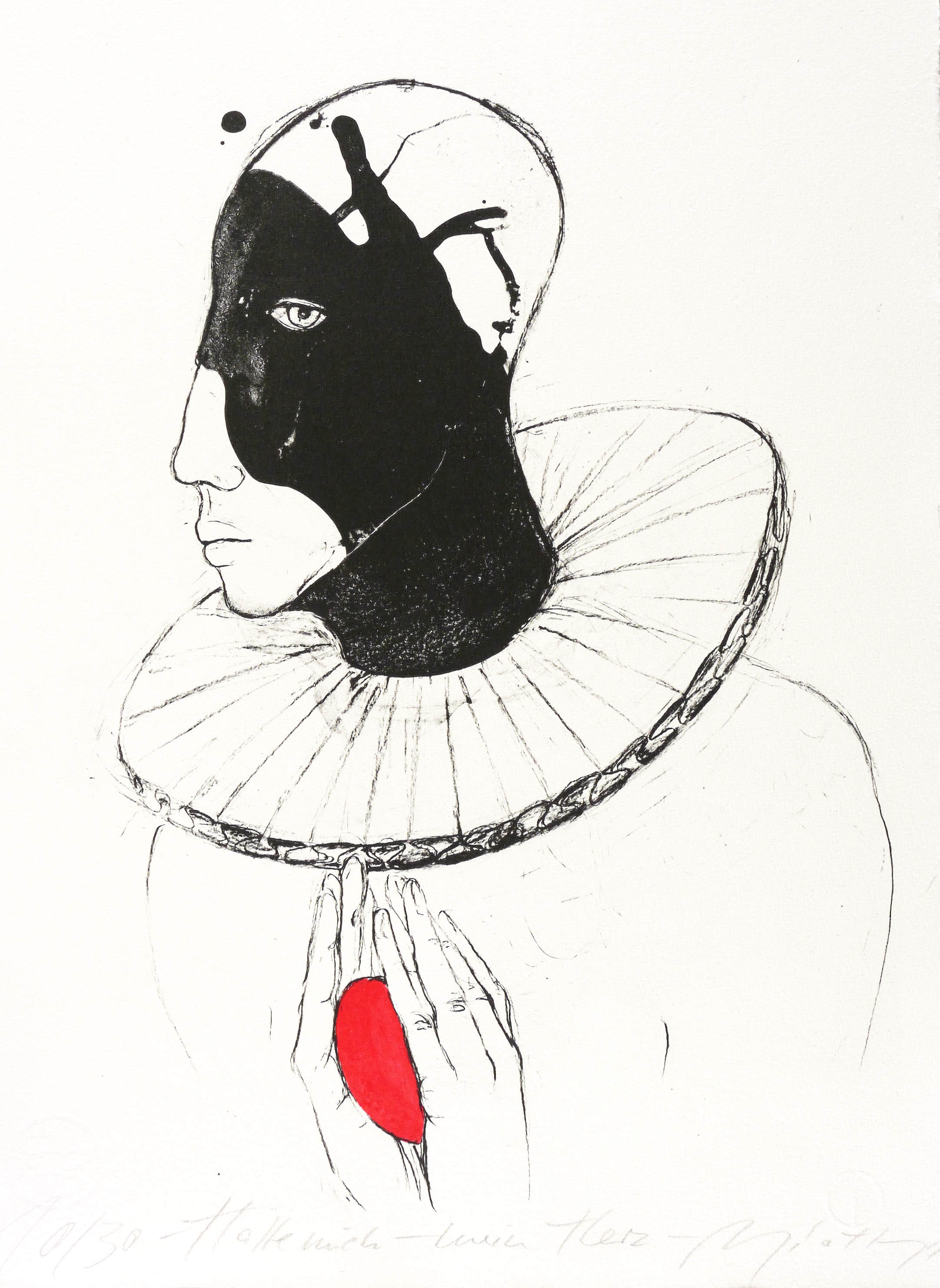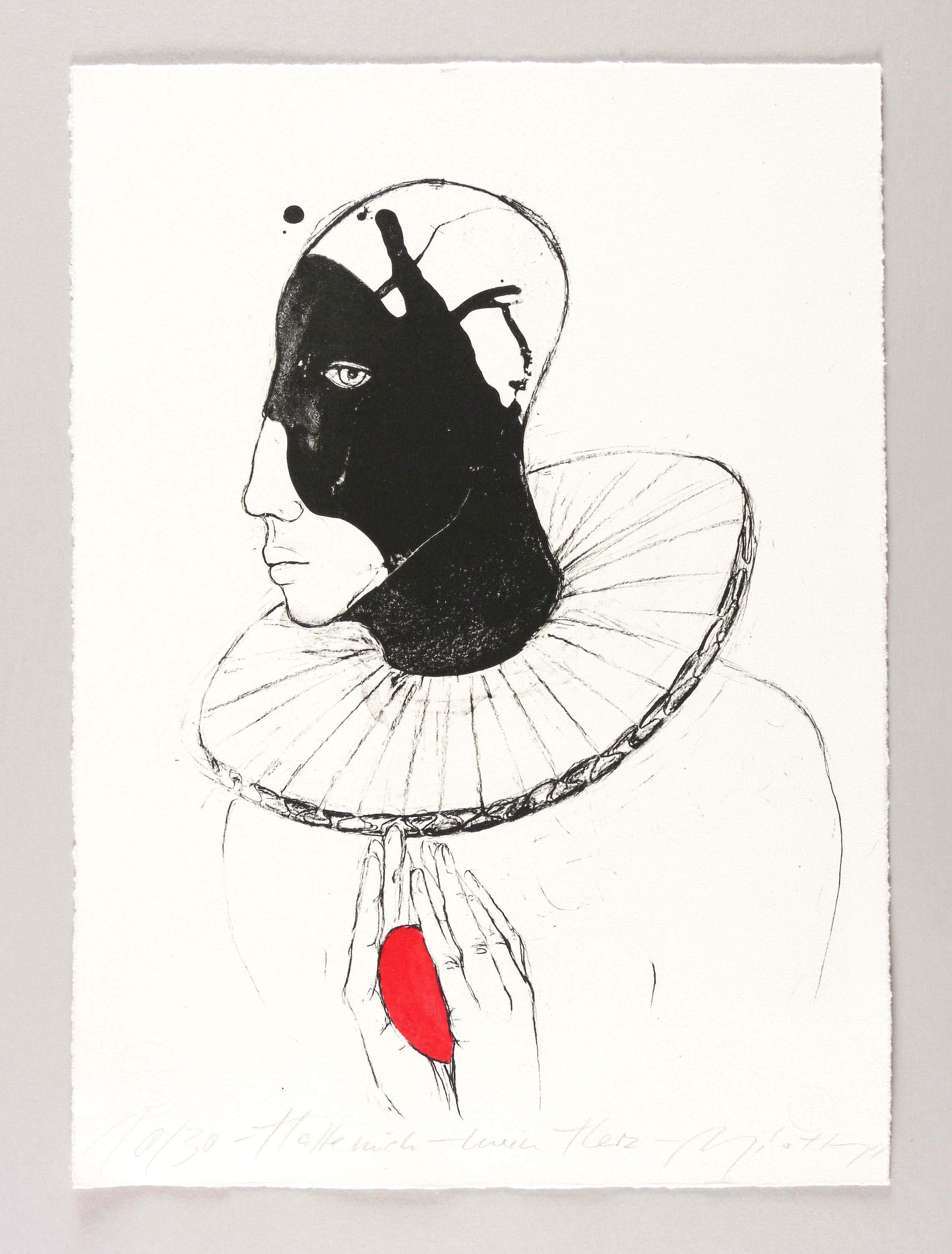 Um 2015. Algrafie / Kreide- & Pinselalgrafie, in Schwarz, auf Hahnemühle-Bütten, partiell koloriert. – Originale Künstlergrafik, von Angela Hampel. – Auflage Exemplar Nr. 10/30. – 37,0 x 27,0 cm (Darstellung), 44 x 32 cm (Blatt).