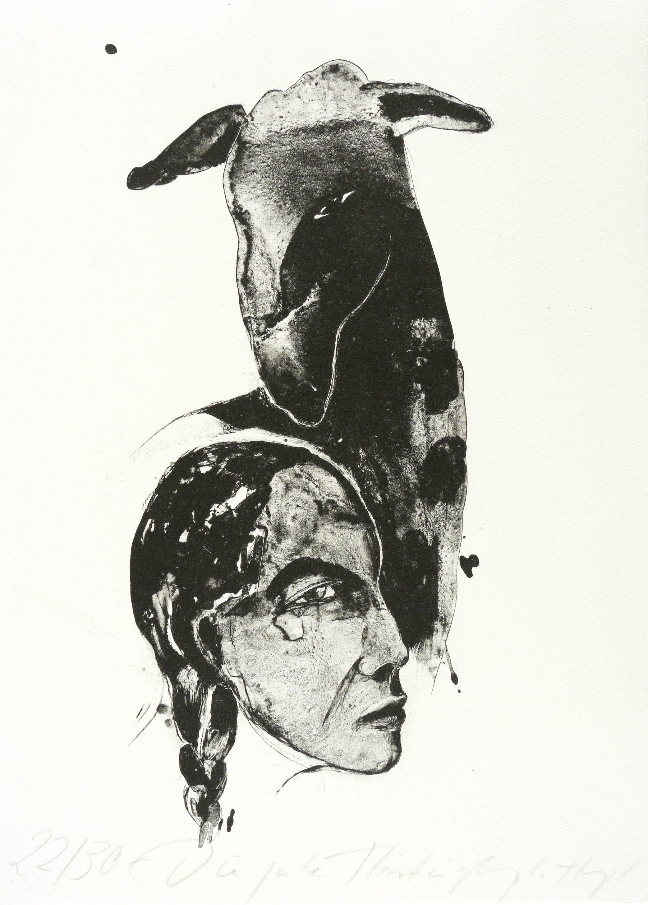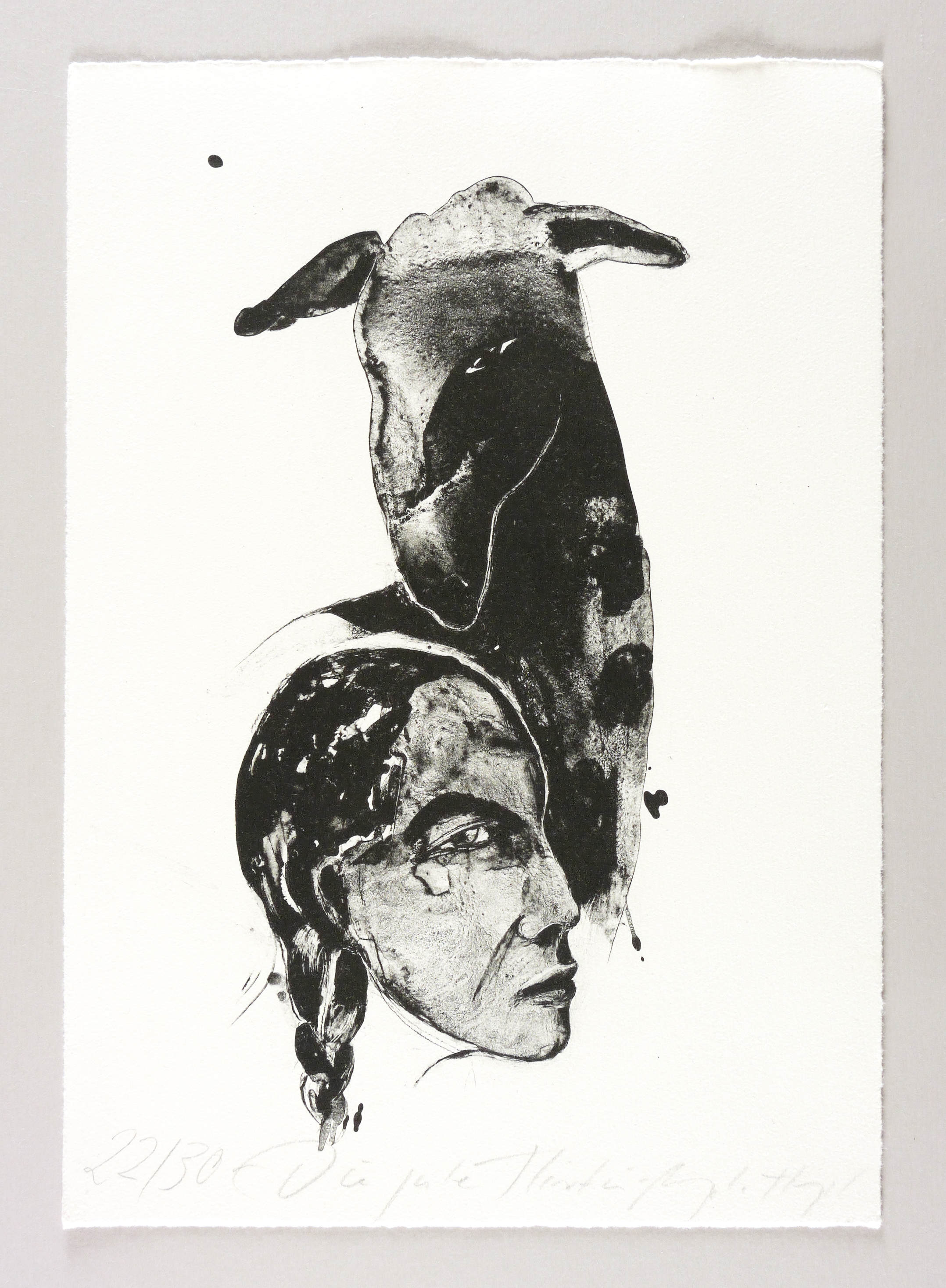 2012. Algrafie / Pinselalgrafie, in Schwarz, auf hellgelbem Hahnemühle-Bütten. – Originale Künstlergrafik, von Angela Hampel. – Auflage Exemplar Nr. 22/30. – 33,0 x 15,5 cm (Darstellung), 38,5 x 27 cm (Blatt).
