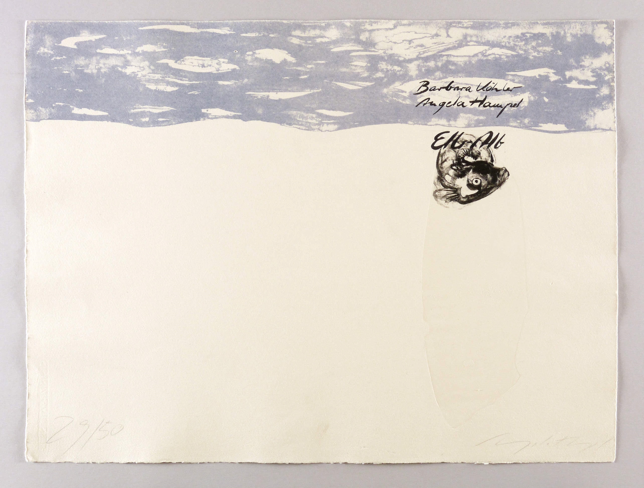 Rechts unten in Bleistift signiert: ″Angela Hampel″. Links Auflagenbezeichnung. Im Stein rechts oben Inschrift: ″Barbara Köhler / Angela Hampel″. Wasserzeichen. – Originalgrafisches Titelblatt zur Mappe ″Elb- Alb″. – Sehr guter Zustand.