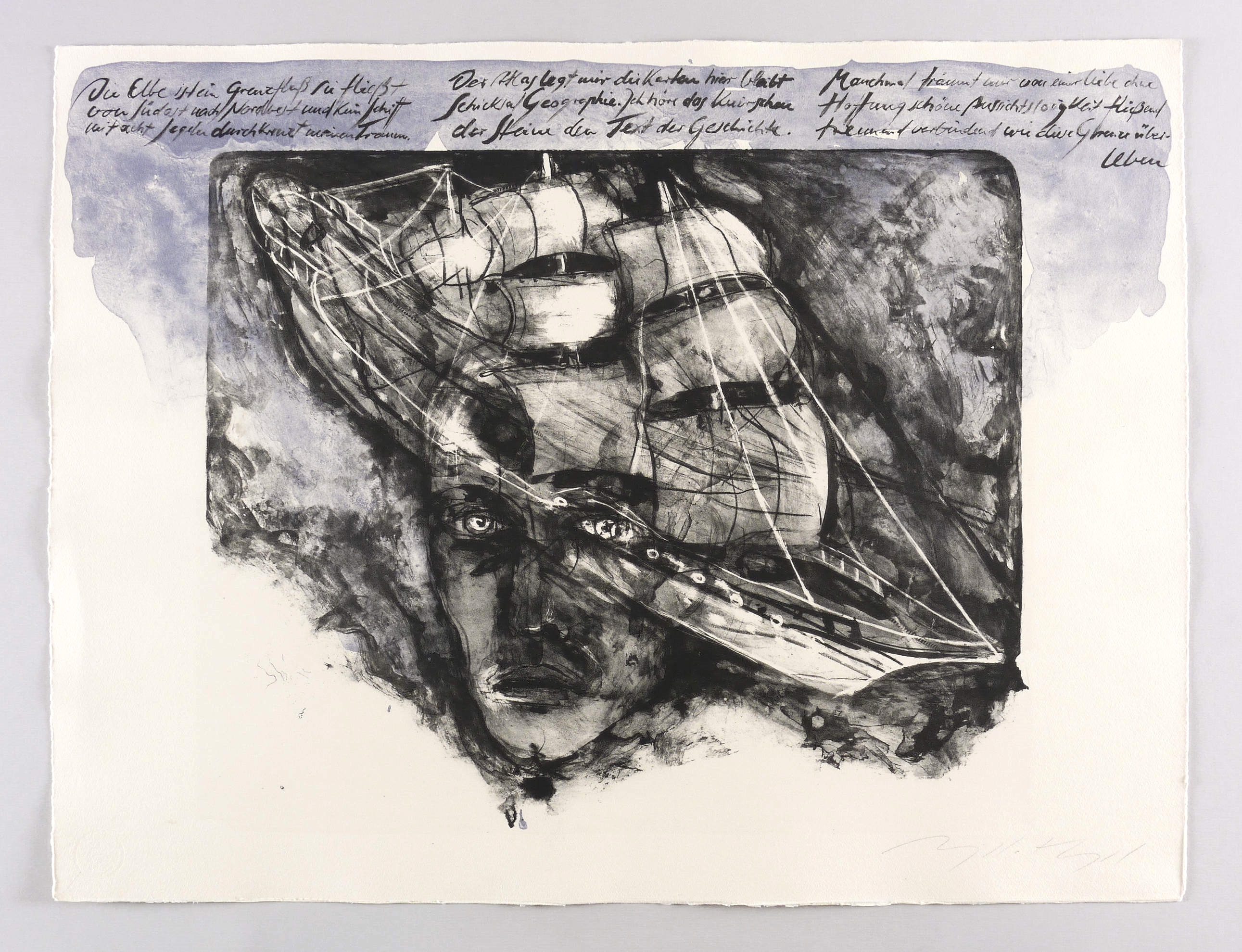 Rechts unten in Bleistift signiert: ″Angela Hampel″. In der Platte Inschrift: ″Die Elbe ist ein grenzfluß sie fließt / von Südost nach Nordwst und kein Schiff / mit acht Segeln durchkreuzt meinen Traum / (...)″. Wasserzeichen. – Zu einem Gedicht von Barbara Köhler. – Sehr guter Zustand.