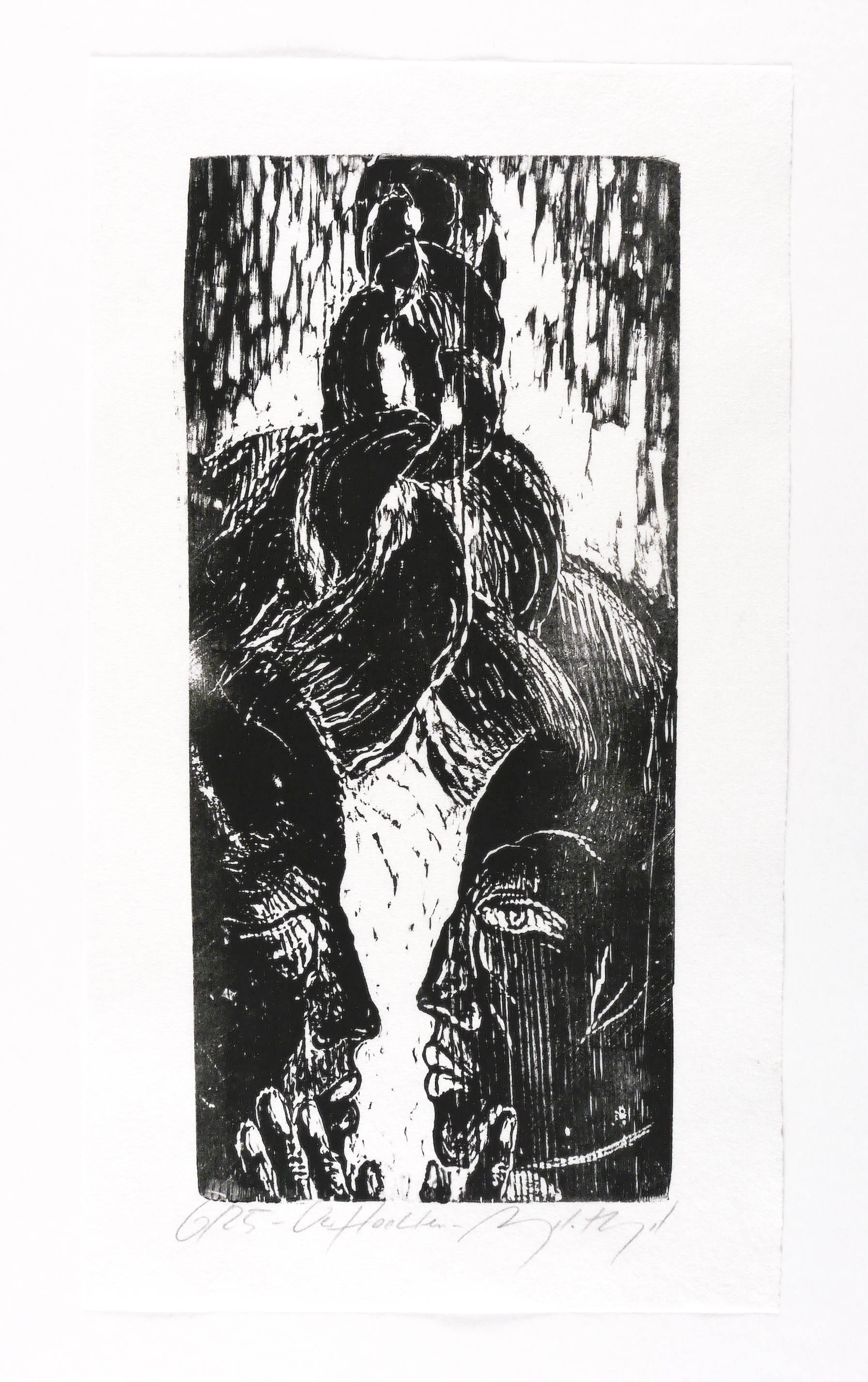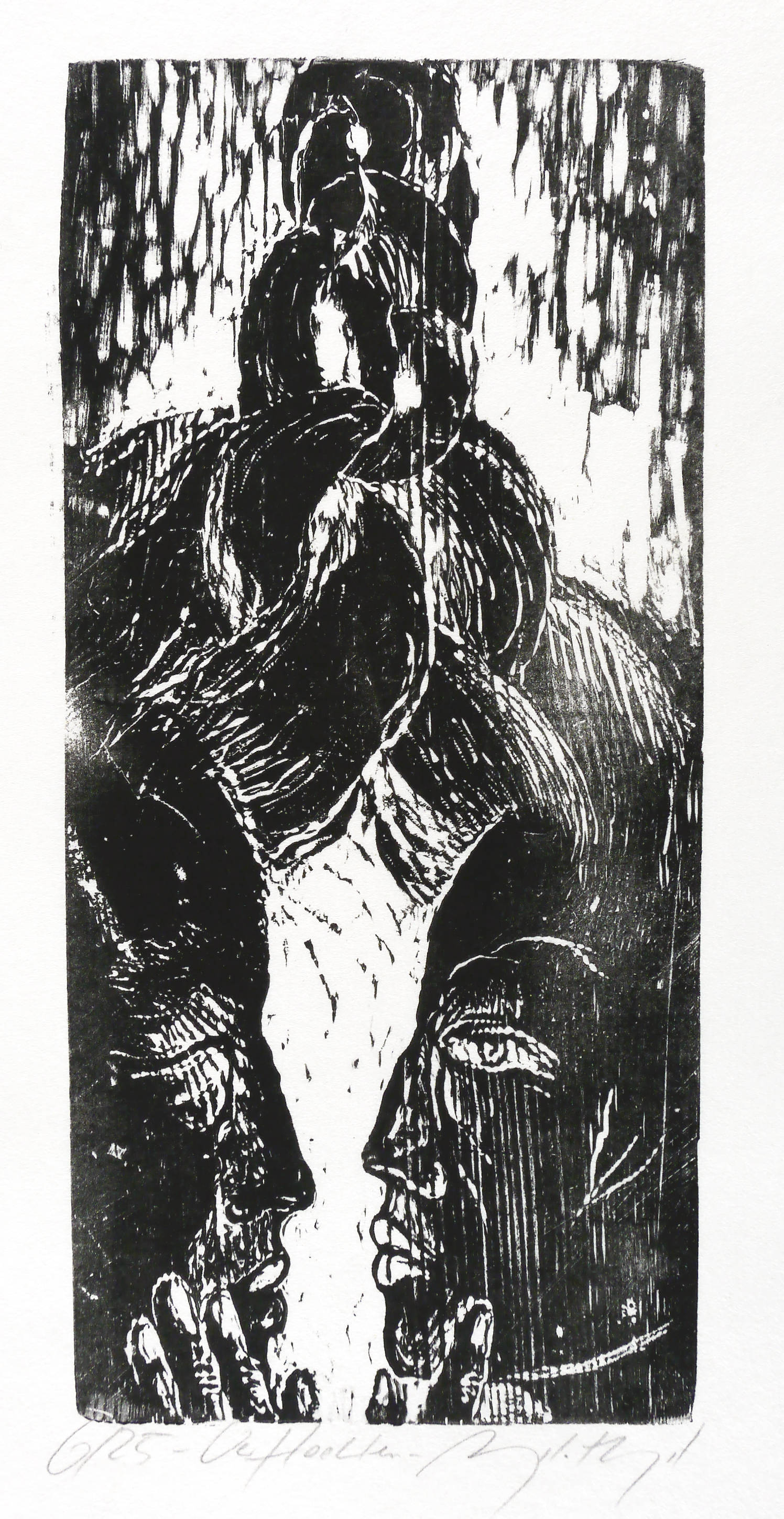 Um 2000. Holzschnitt, in Schwarz, auf weißlichem Similijapan. – Originale Künstlergrafik, von Angela Hampel. – Auflage Exemplar Nr. 6/25. – 29,9 x 14,0 cm (Darstellung / Druckbild), 36 x 20 cm (Blatt).