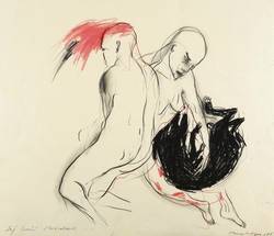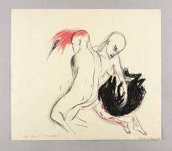 Angela Hampel (*1956 Räckelwitz, lebt und arbeitet in Dresden). Deutsche Malerin und Grafikerin. Lehre und Arbeit als Forstfacharbeiterin. 1977-82 Studium an der HfBK Dresden bei Jutta Damme und D. Büttner. Danach freischaffend. Mitbegründerin der Dresdner Sezession '89. Zahlreiche Einzelausstellungen u.a. in der Galerie Döbele. In ihren Figuren einen sich das Weibliche und das Männliche, das Menschliche und das Tierische, kämpfen gegen einander oder um einander - vital, agressiv und zärtlich zugleich.