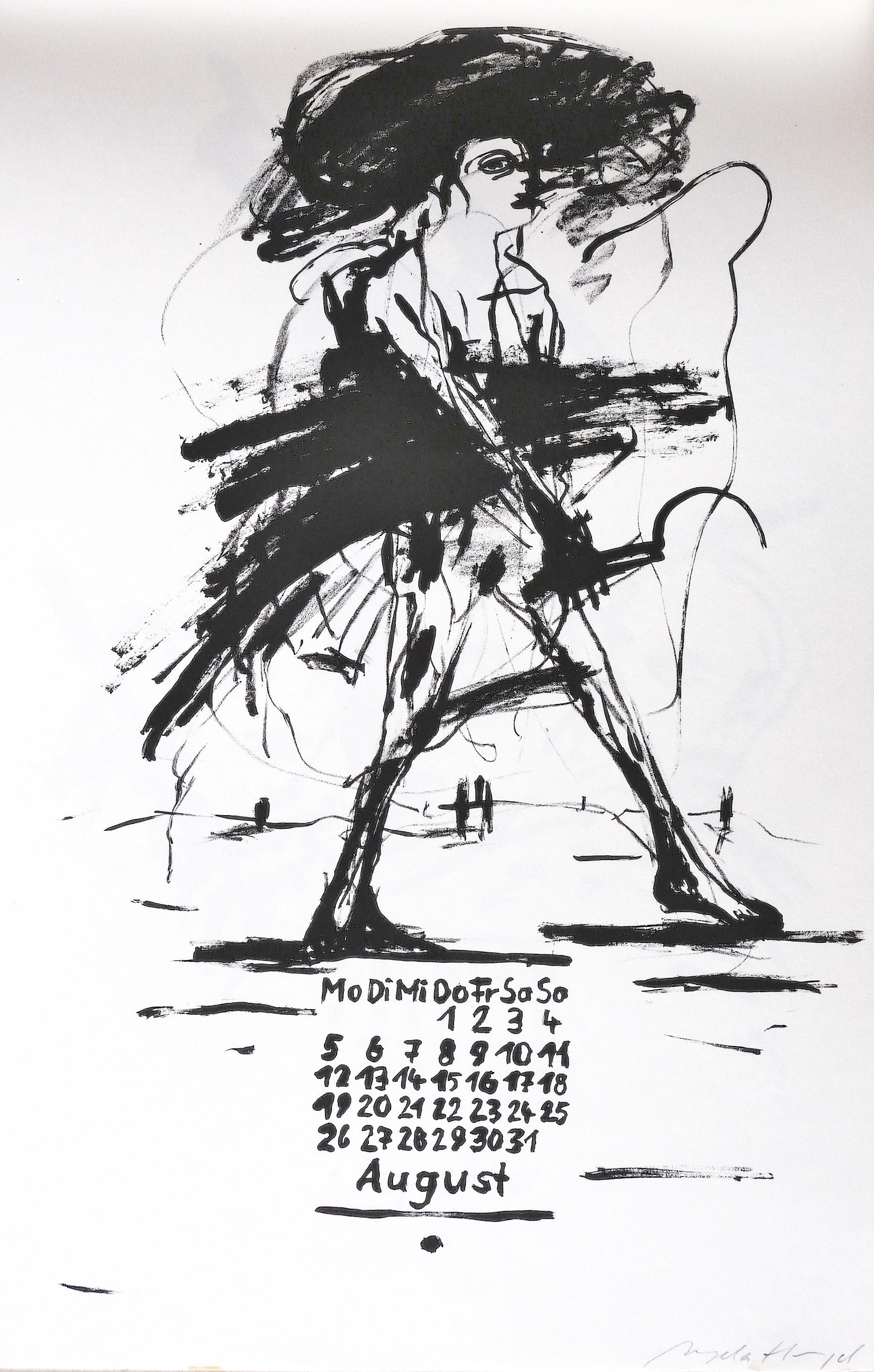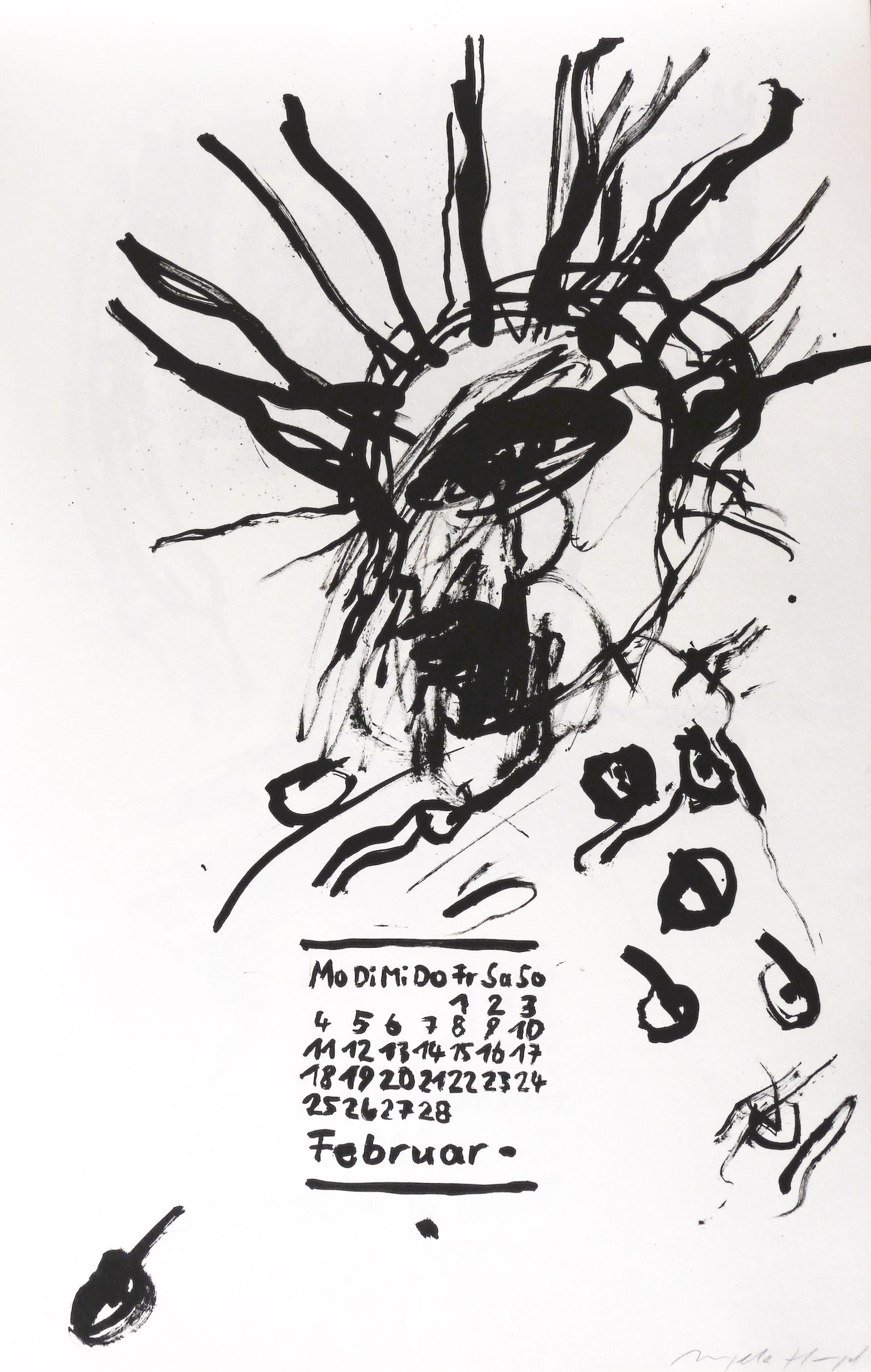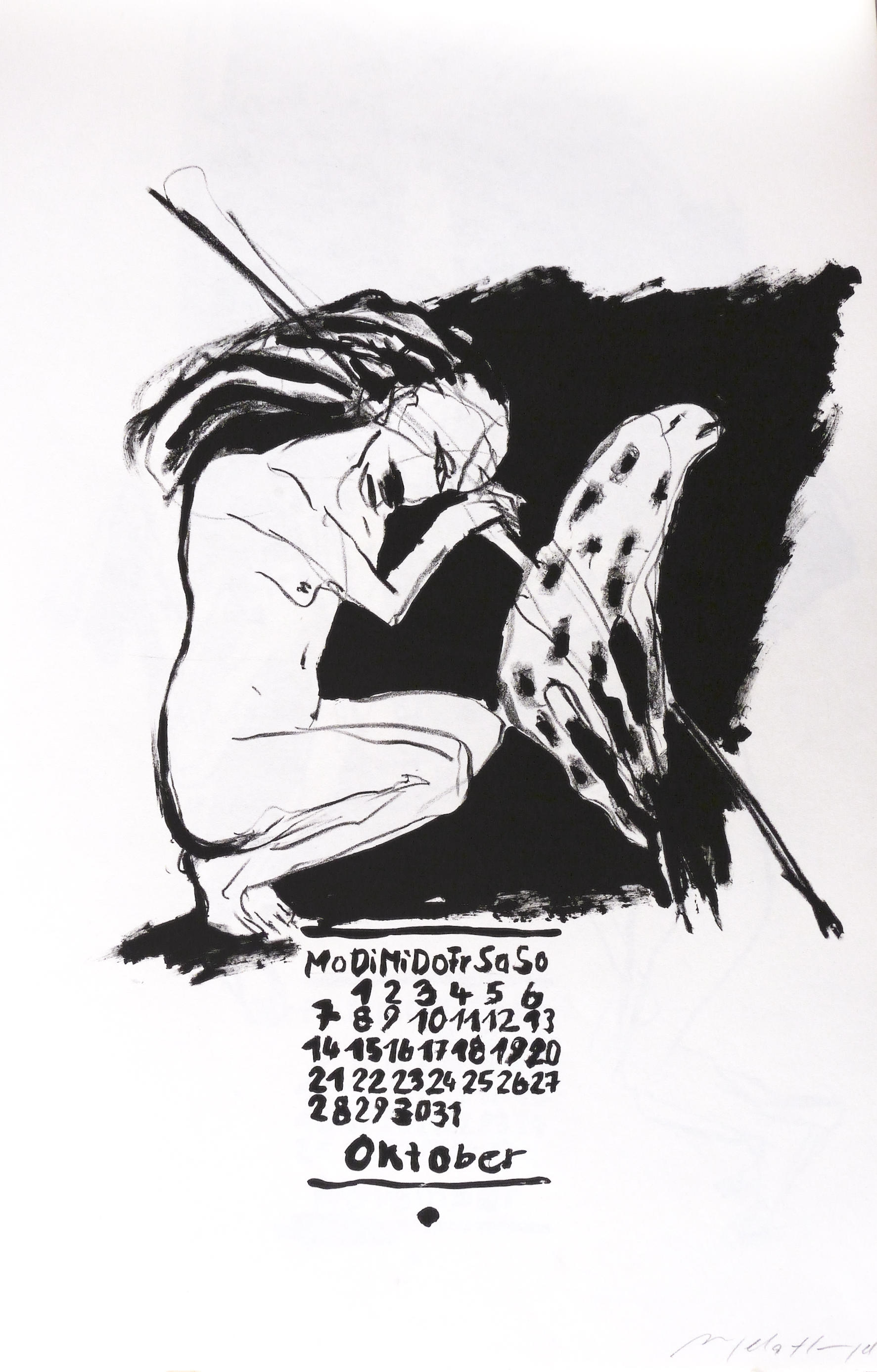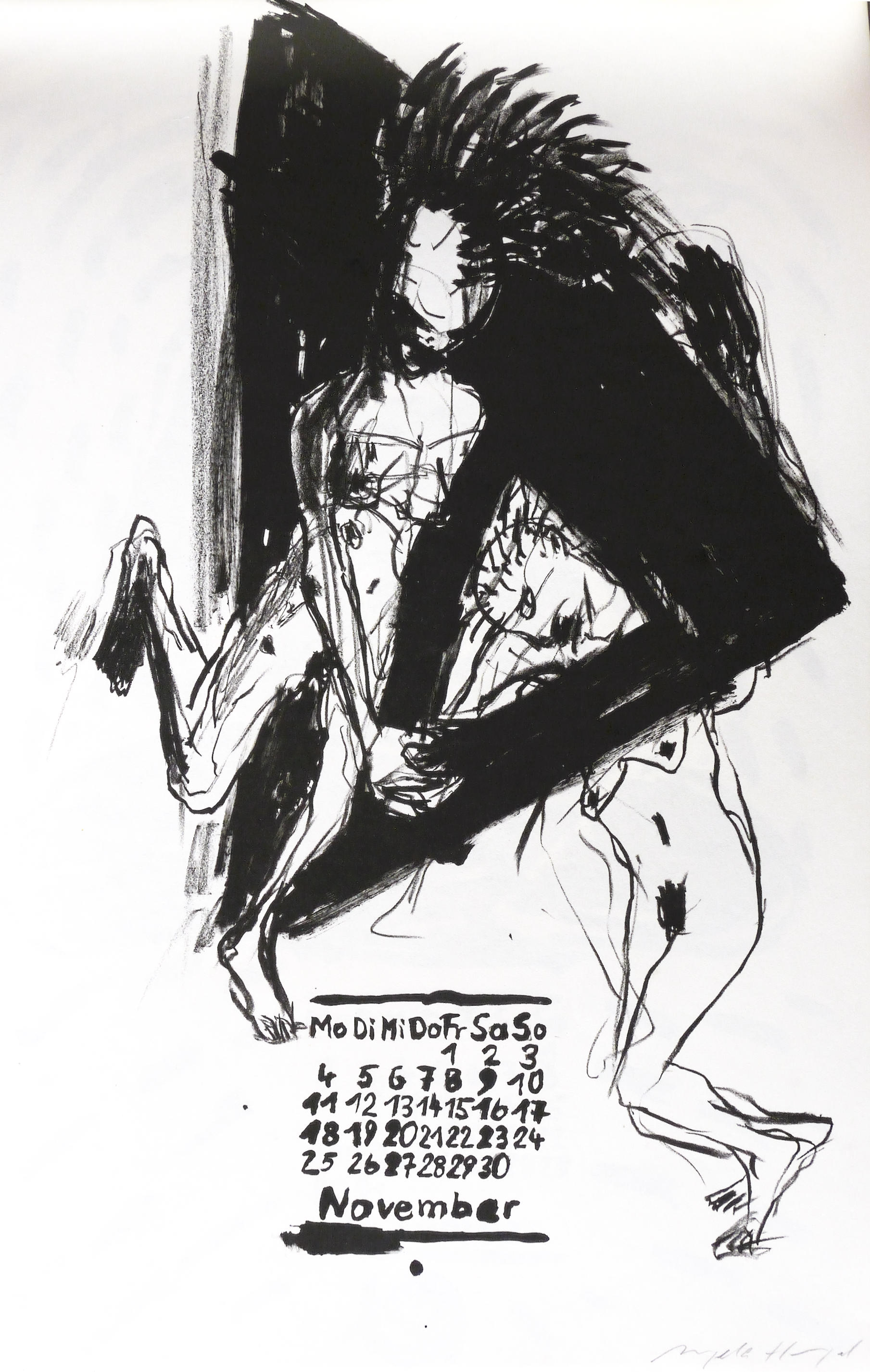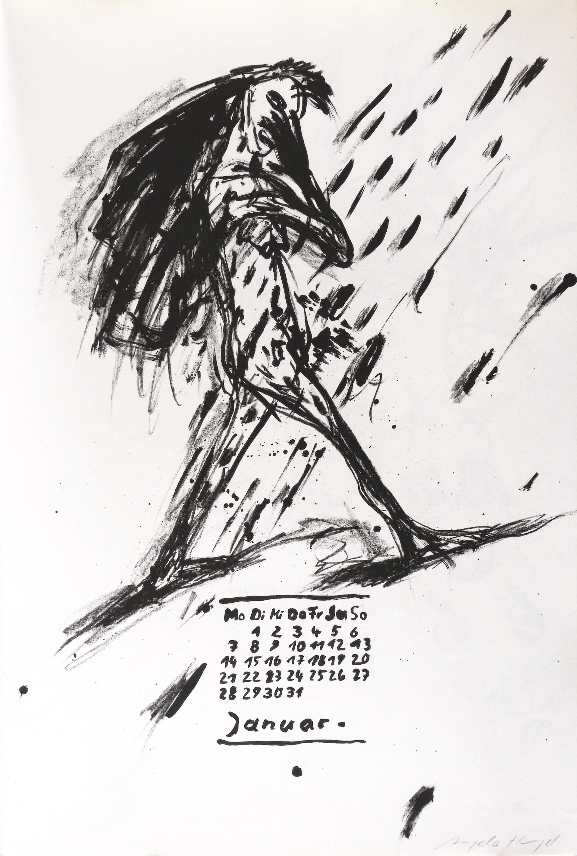 1984. Lithografie / Kreide- & Pinsellithografie, 12 Blatt, in Schwarz, auf hellem leichtem Velin. – Originalgrafischer Kalender, von Angela Hampel. – Auflage Exemplar Nr. 1/30. – 46,5 x 30,0 cm (Blätter).