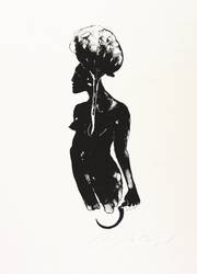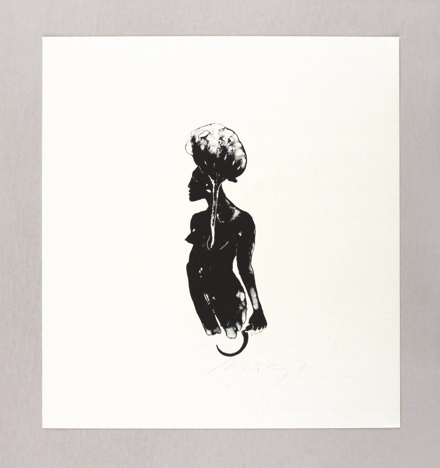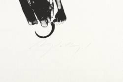 1998. Algrafie / Pinselalgrafie, in Schwarz, auf leichtem hellgelbem Maschinenbütten. – Originale Künstlergrafik, von Angela Hampel. – Auflage 120 Exemplare. – 19,7 x 6,8 cm (Darstellung / Druckbild), 33 x 30 cm (Blatt).