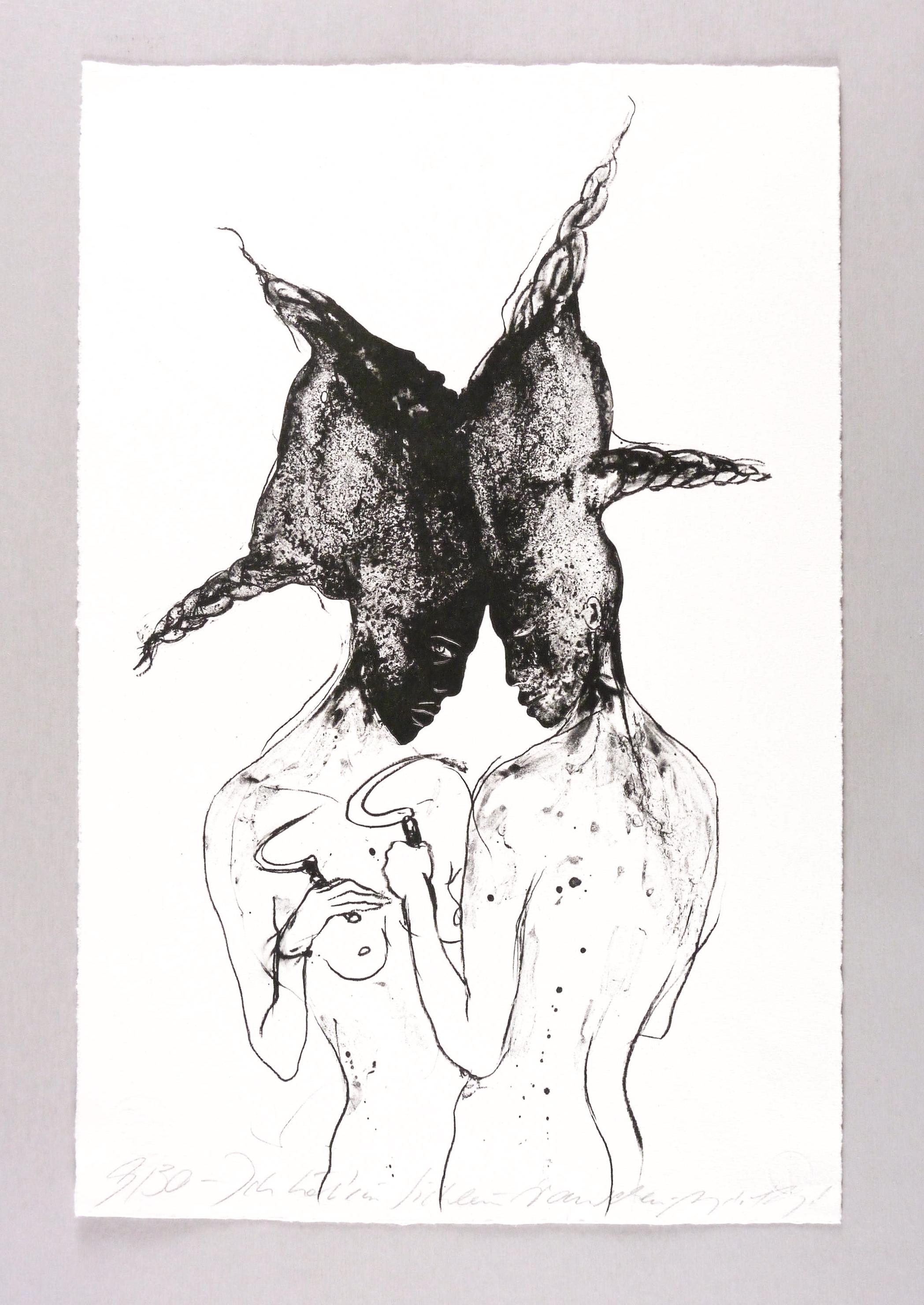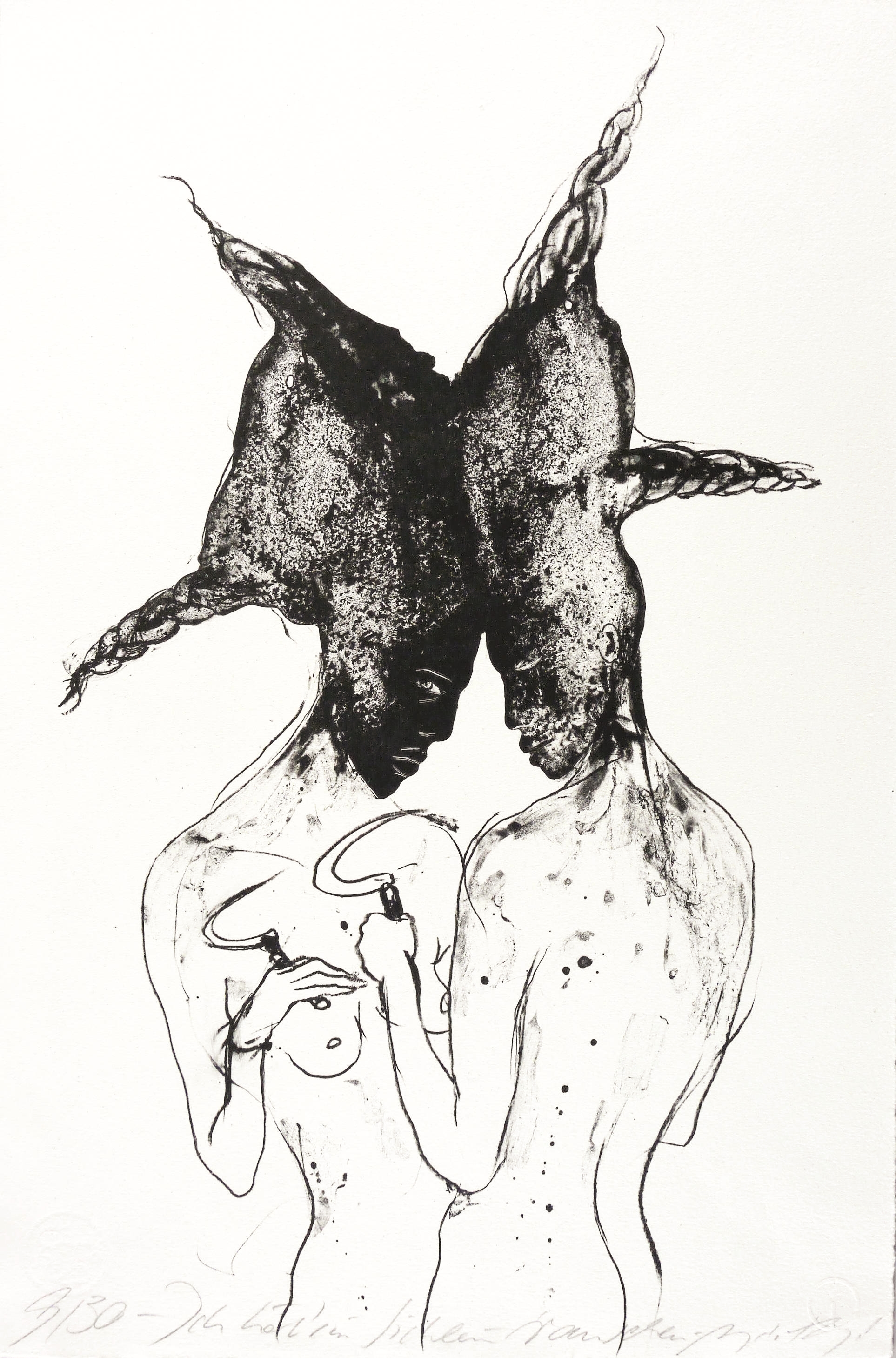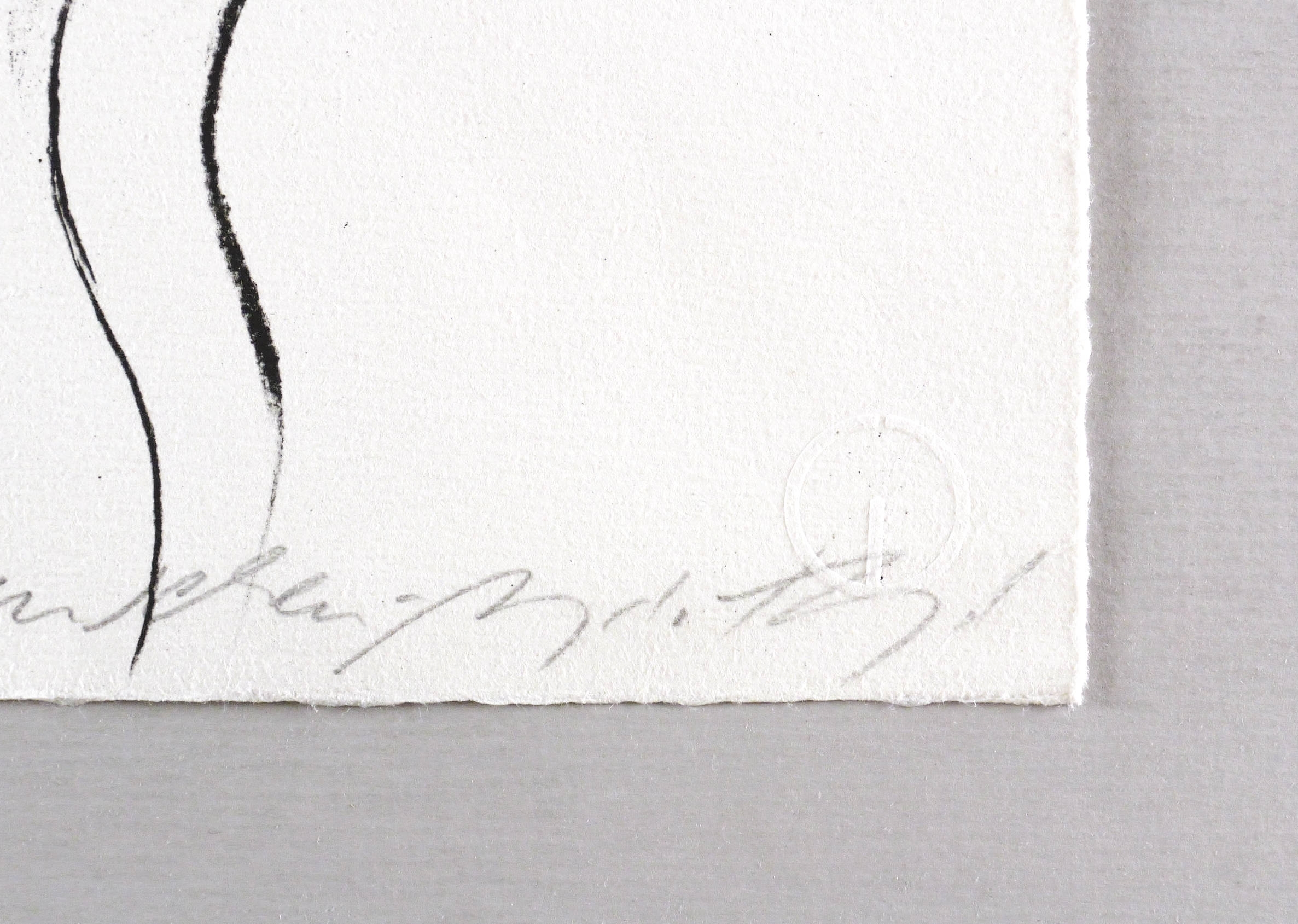 Um 1995. Algrafie, in Schwarz, auf weichem hellchamois Hahnemühle. – Originale Künstlergrafik, von Angela Hampel. – Auflage Exemplar Nr. 9/30. – 47,5 x 27,5 cm (Darstellung / Druckbild), 50 x 33 cm (Blatt).
