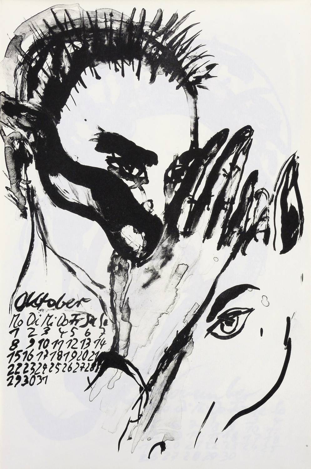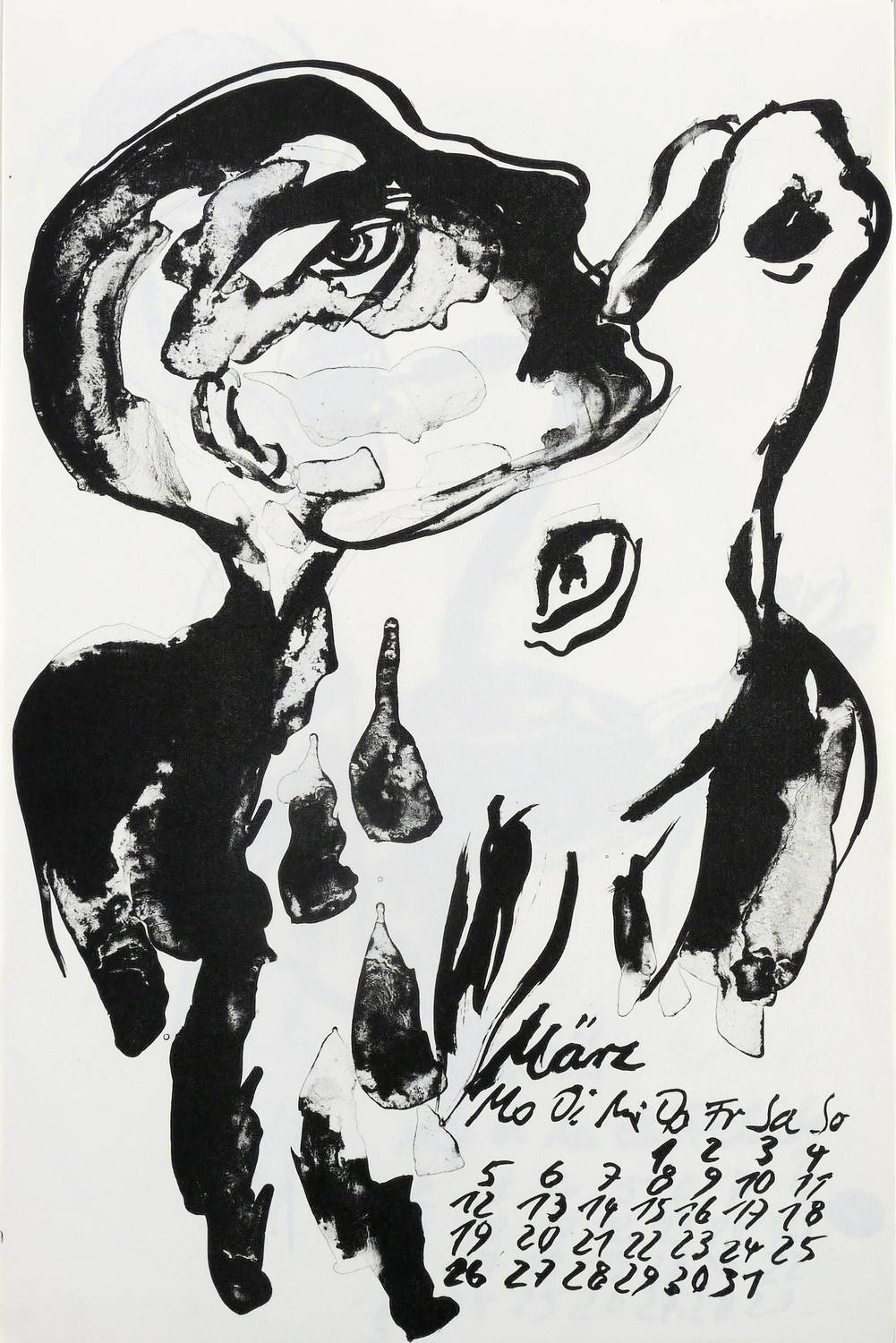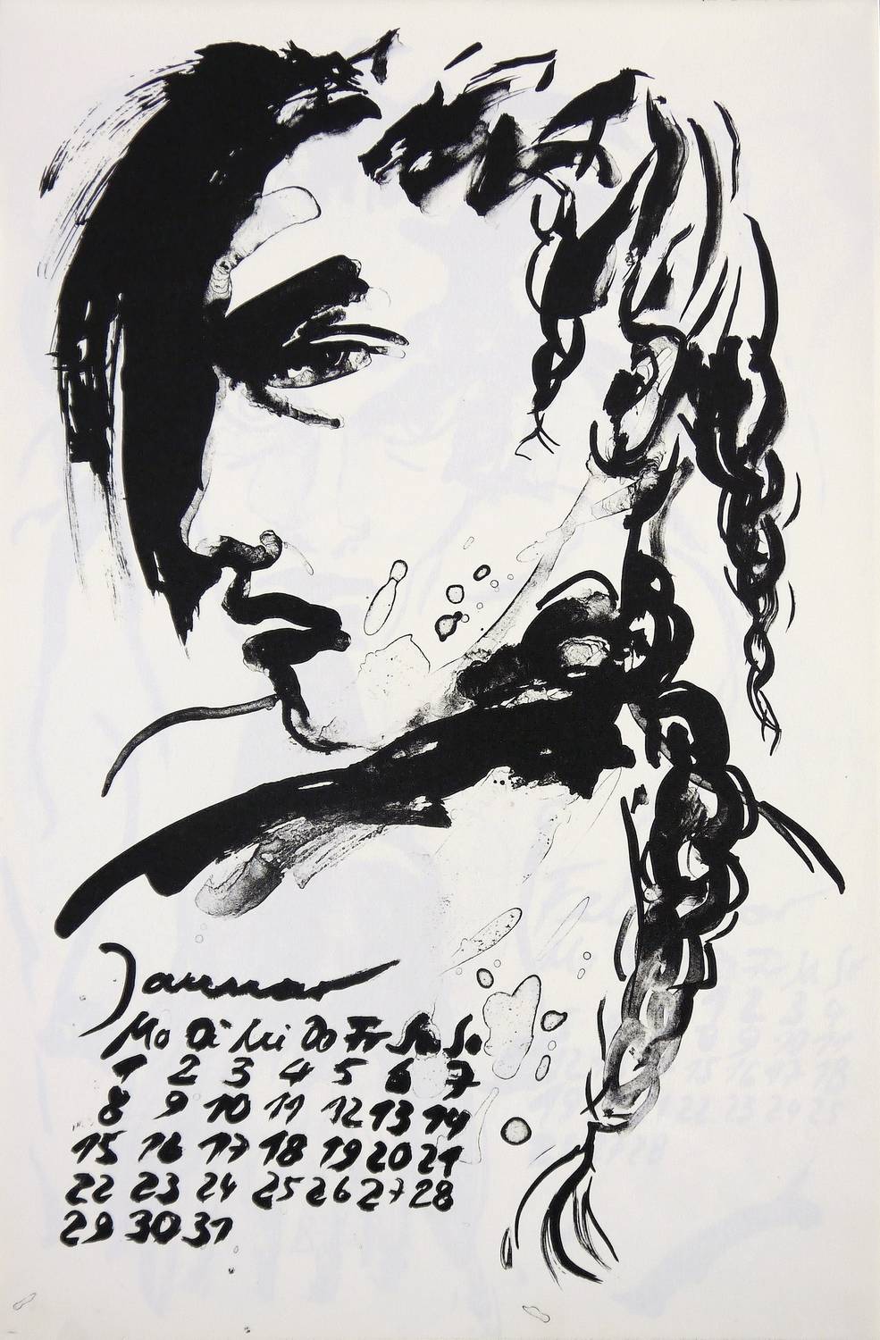 1989. Algrafie / Pinselalgrafie, 12 Blatt, in Schwarz, auf hellchamois Maschinenbütten. – Originalgrafischer Kalender, von Angela Hampel. – Auflage Exemplar Nr. 8/50. – 47,0 x 30,5 cm (Blätter).