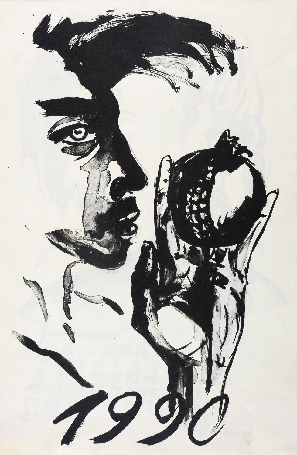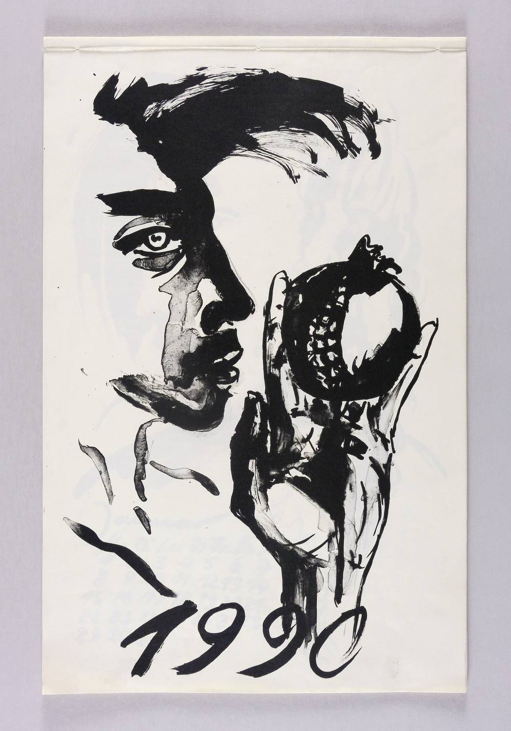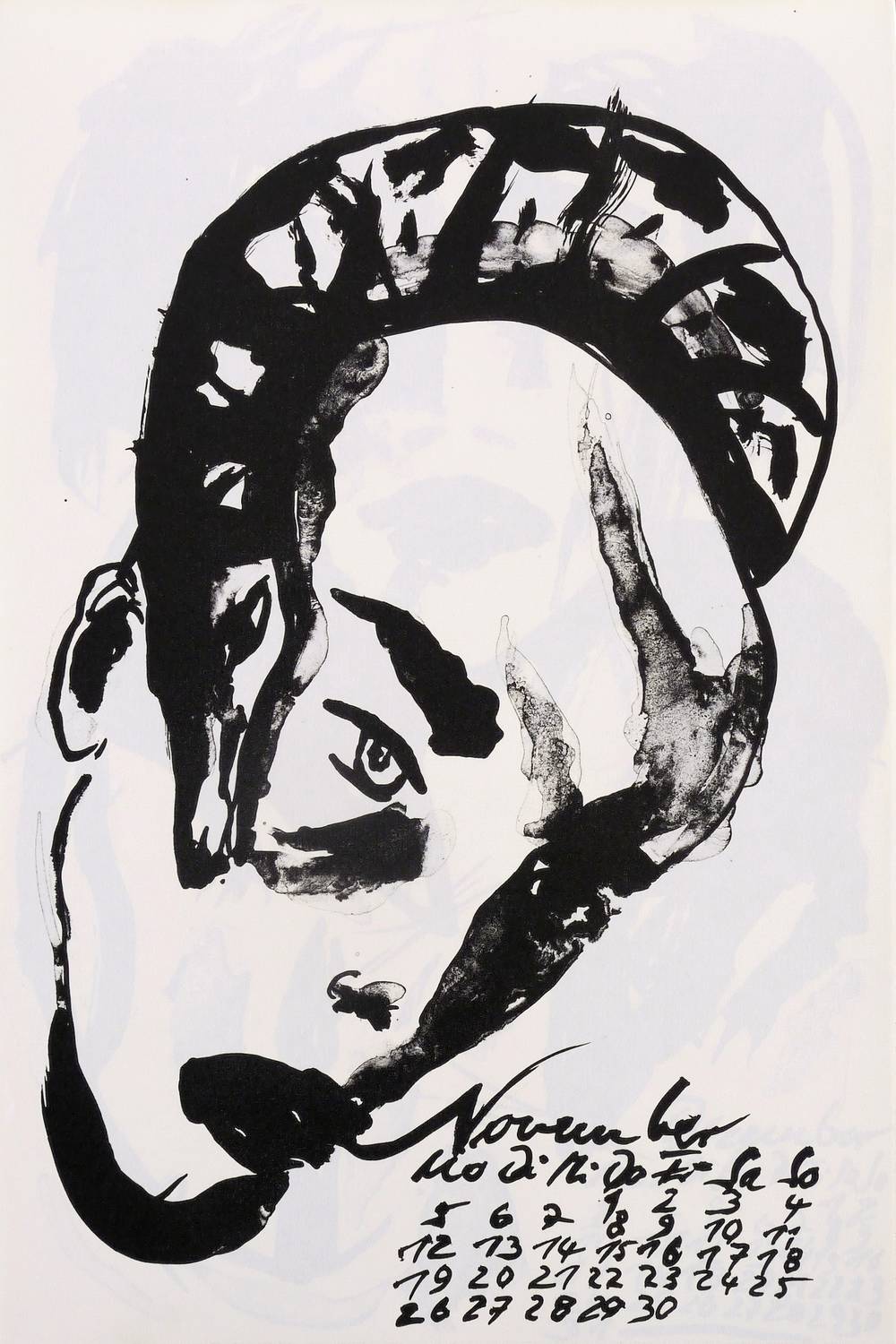 1989. Algrafie / Pinselalgrafie, 12 Blatt, in Schwarz, auf hellchamois Maschinenbütten. – Originalgrafischer Kalender, von Angela Hampel. – Auflage Exemplar Nr. 8/50. – 47,0 x 30,5 cm (Blätter).
