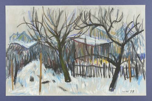 1979. Zeichnung / Pastellkreide, auf hellgrauem Büttenpapier. – Originale Künstlergrafik, von Werner Haselhuhn. – Unikat. – 31,0 x 47,5 cm (Darstellung / Blatt).