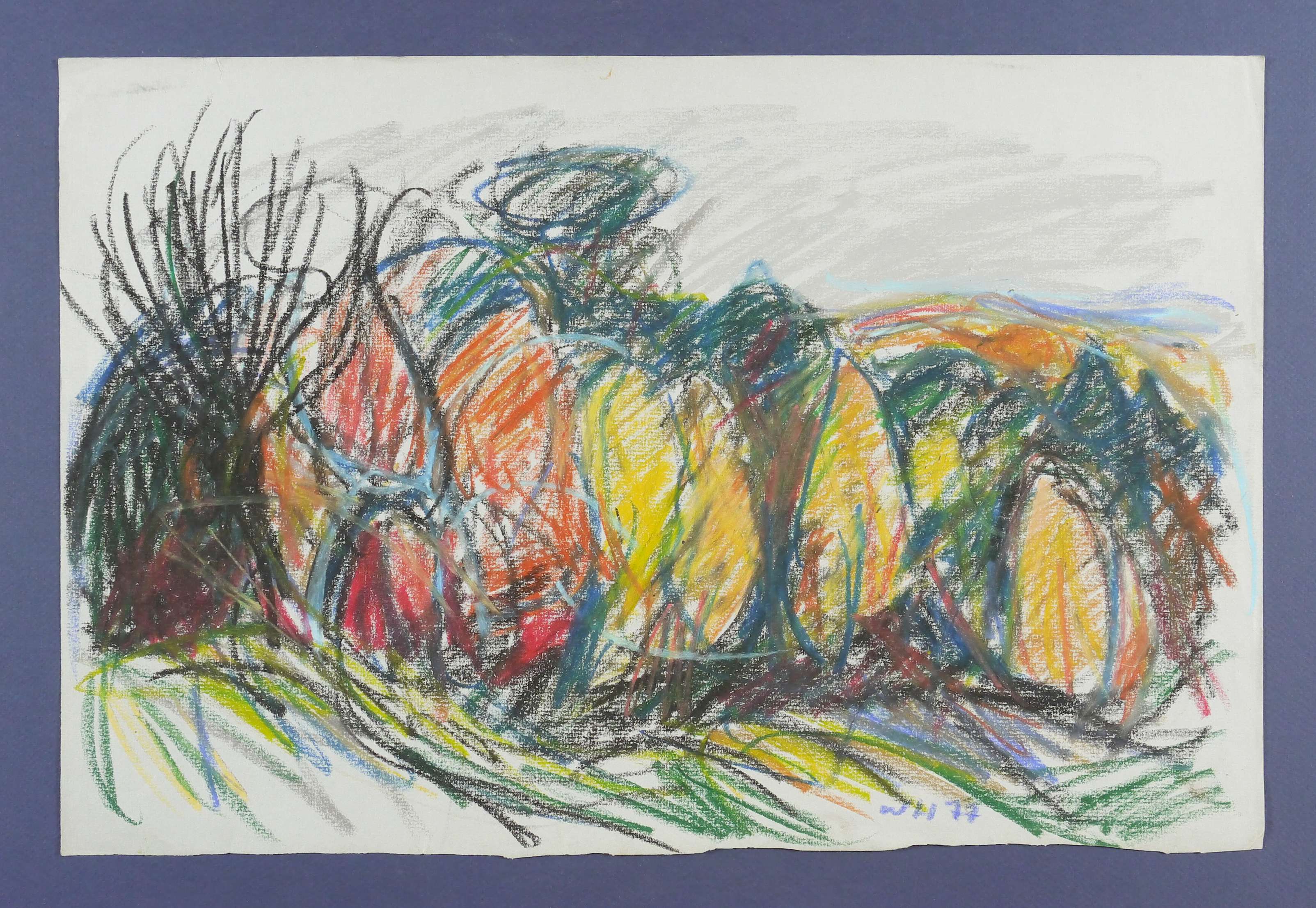 1977. Zeichnung / Pastellkreide, auf hellgrauem Büttenpapier. – Originale Künstlergrafik, von Werner Haselhuhn. – Unikat. – 32,5 x 49,0 cm (Darstellung / Blatt).