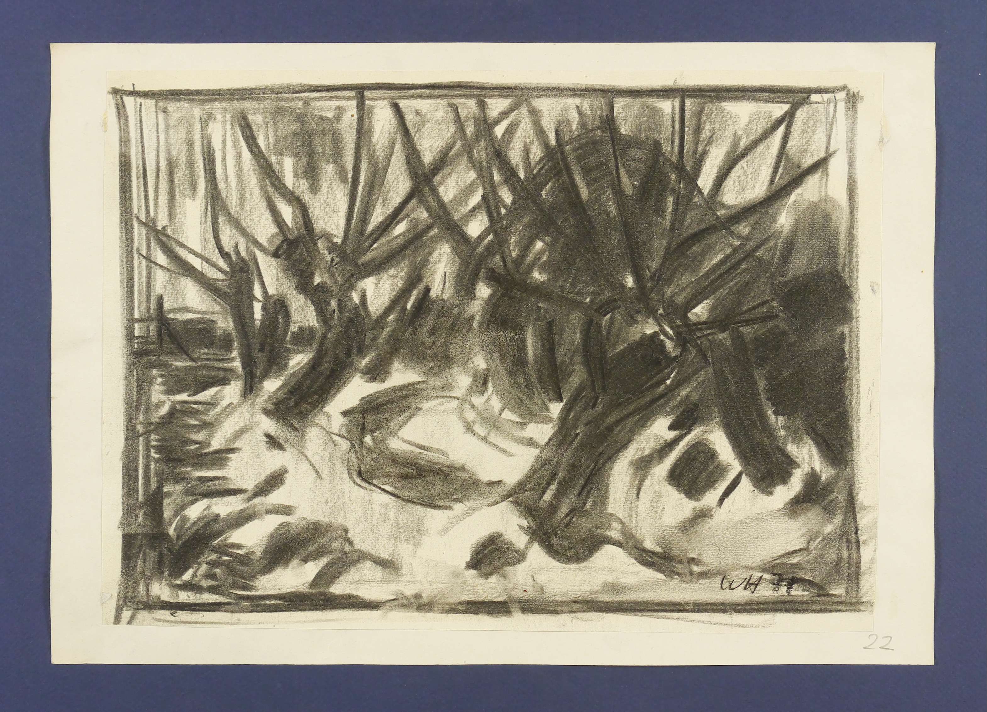 Rechts unten monogrammiert und datiert. – Etwas atelierspurig. An den Ecken mit Kleber auf Trägerpapier montiert. Insgesamt guter Gesamtzustand.