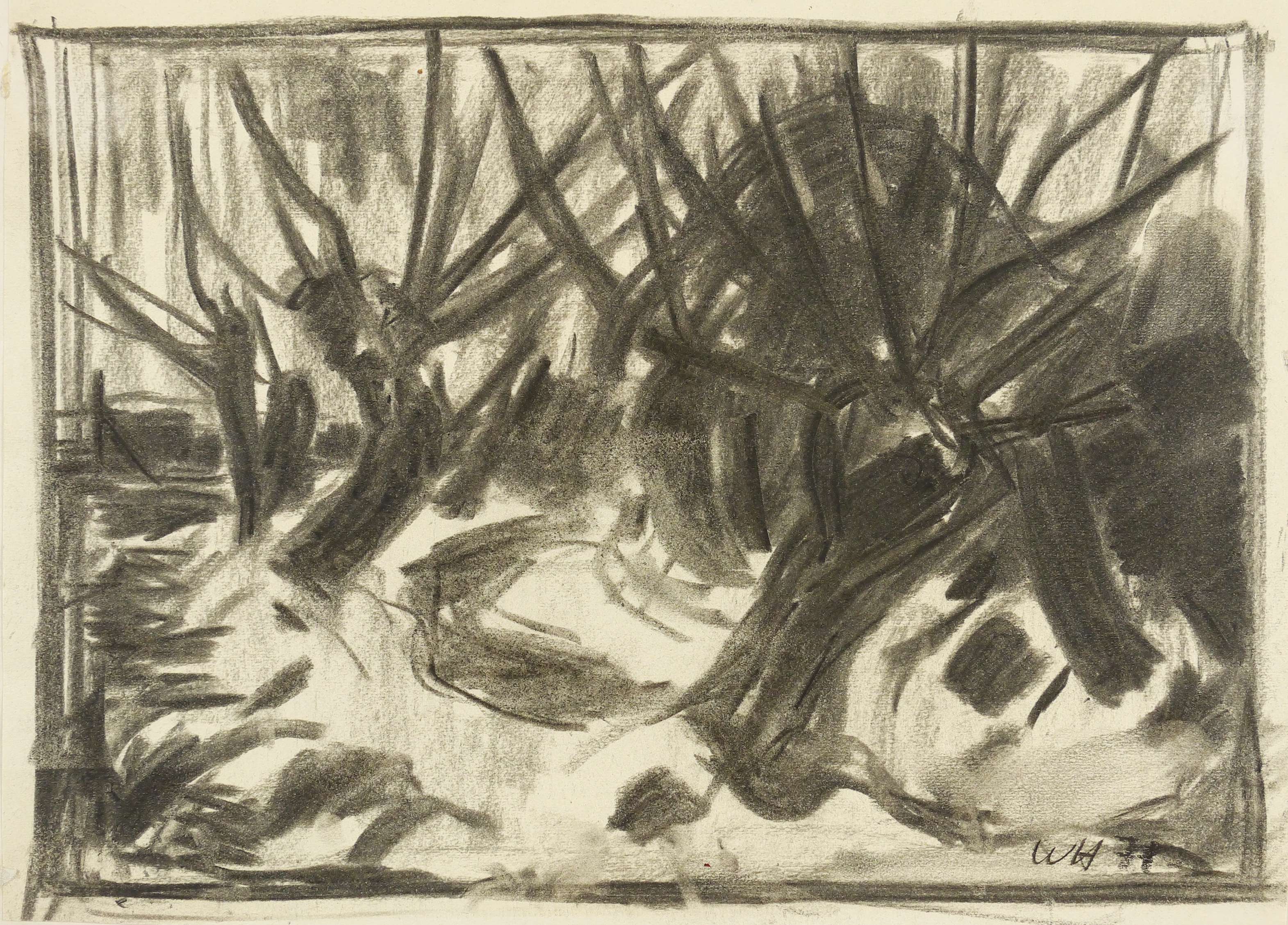 1977. Zeichnung / Kohlezeichnung, auf Papier. – Originale Künstlergrafik, von Werner Haselhuhn. – Unikat. – 26,5 x 36,5 cm (Darstellung / Blatt).