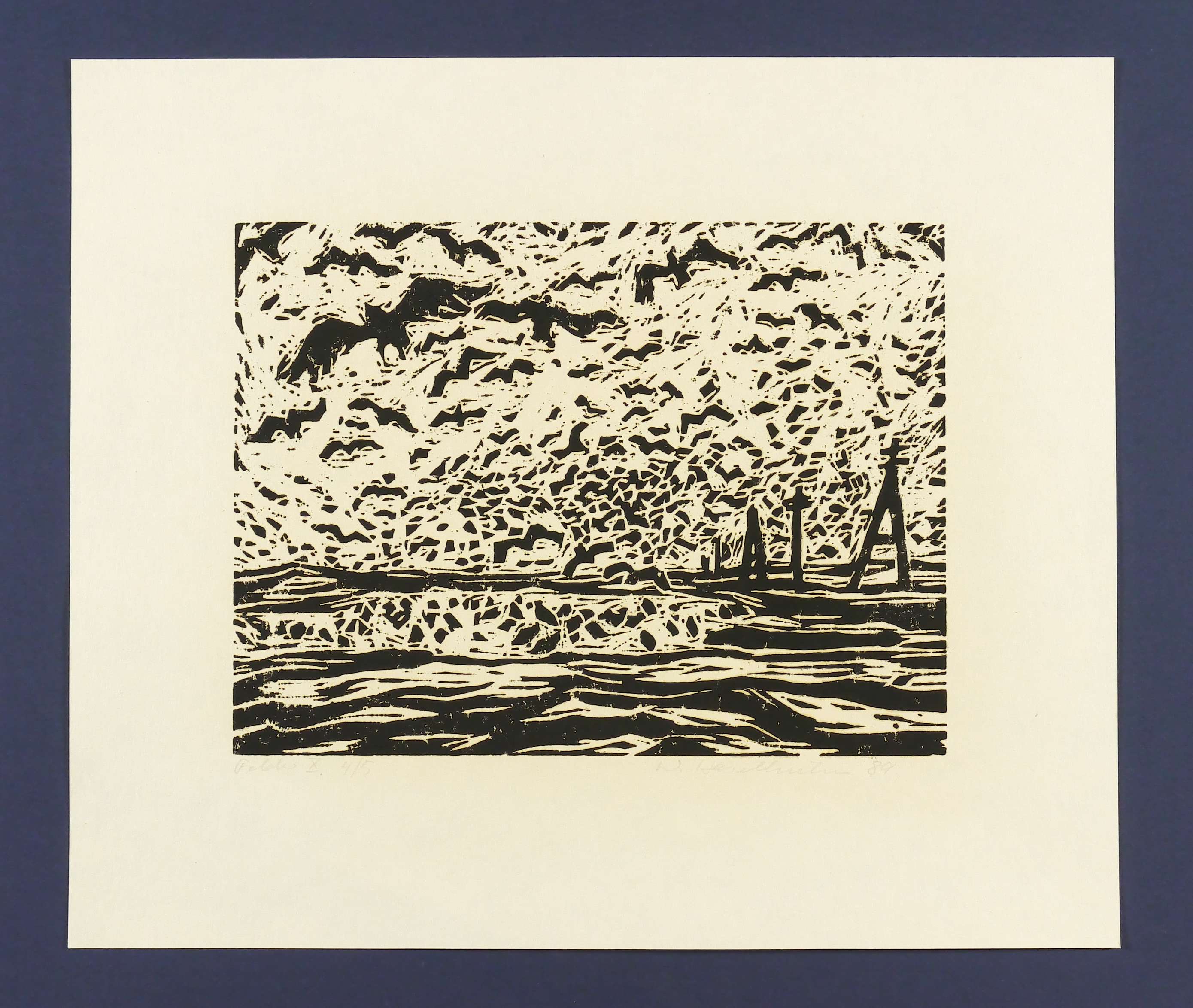 Außerhalb des Druckstocks in Bleistift signiert und datiert unten rechts sowie links unten betitelt. – Vogelschwarm über einem Feld. – Papier etwas gebräunt. Guter Gesamtzustand.