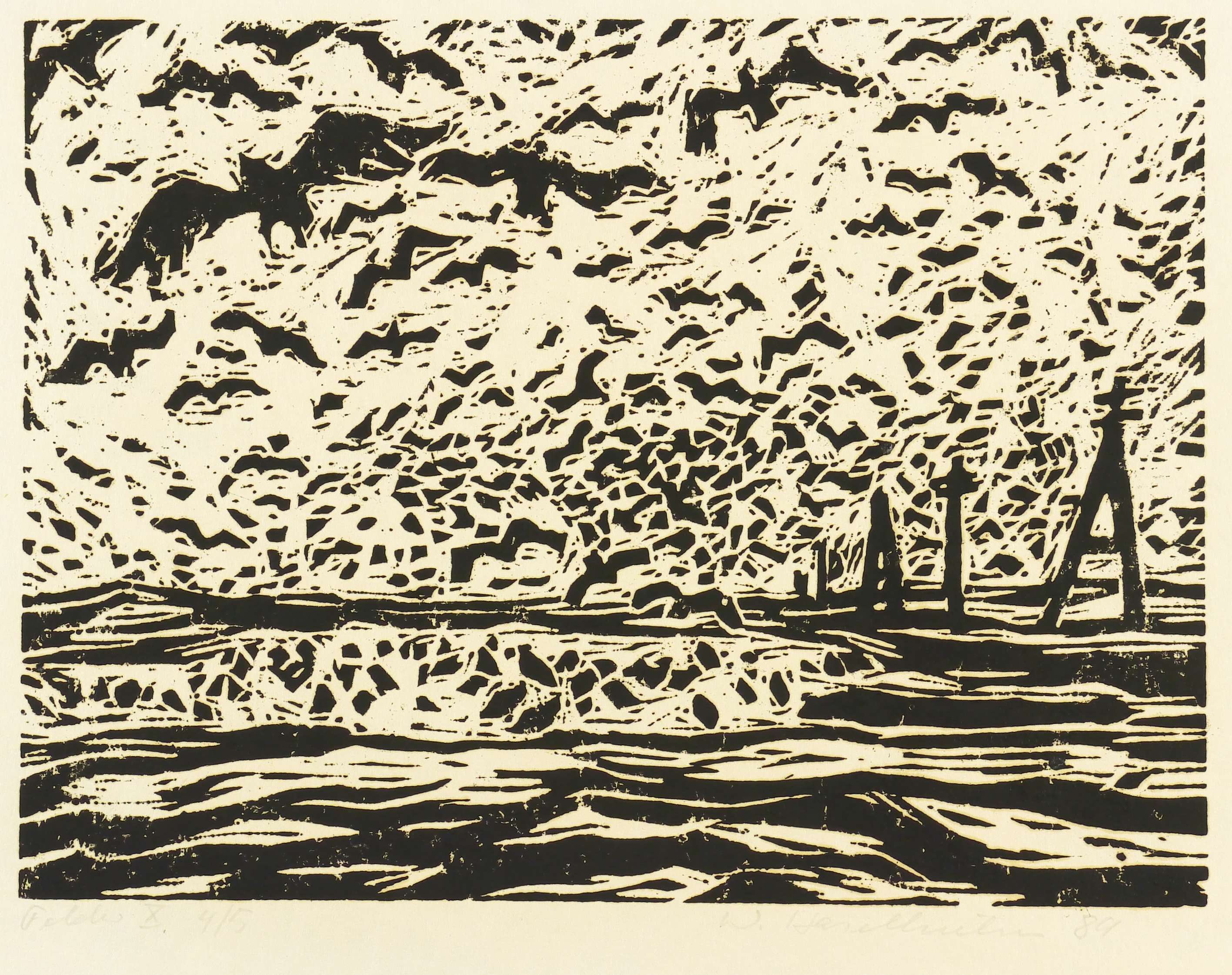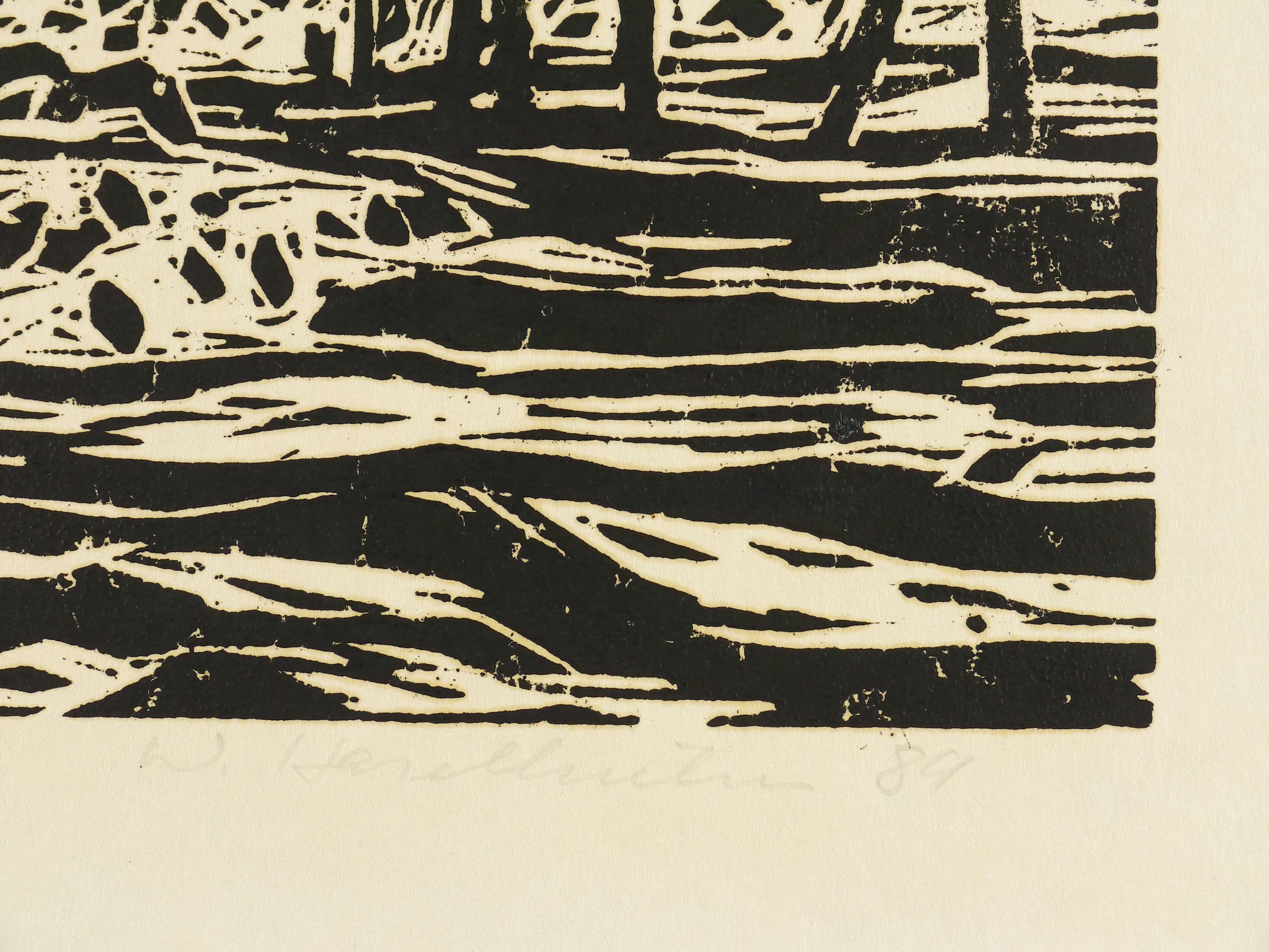 1989. Holzschnitt, in Schwarz, auf hellgelbem Velin. – Originale Künstlergrafik, von Werner Haselhuhn. – Auflage Exemplar Nr. 4/5. – 24,0 x 32,0 cm (Darstellung / Druckstock), 40 x 47 cm (Blatt).