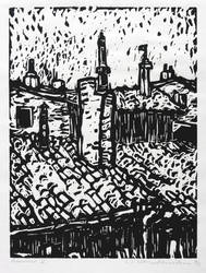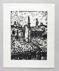 Rechts unten in Bleistift signiert und datiert: ″W. Haselhuhn 92″. Links betitelt: ″Provence V″. – Aus einer Holzschnitt-Folge zur Provence. – Sehr gutes Exemplar.