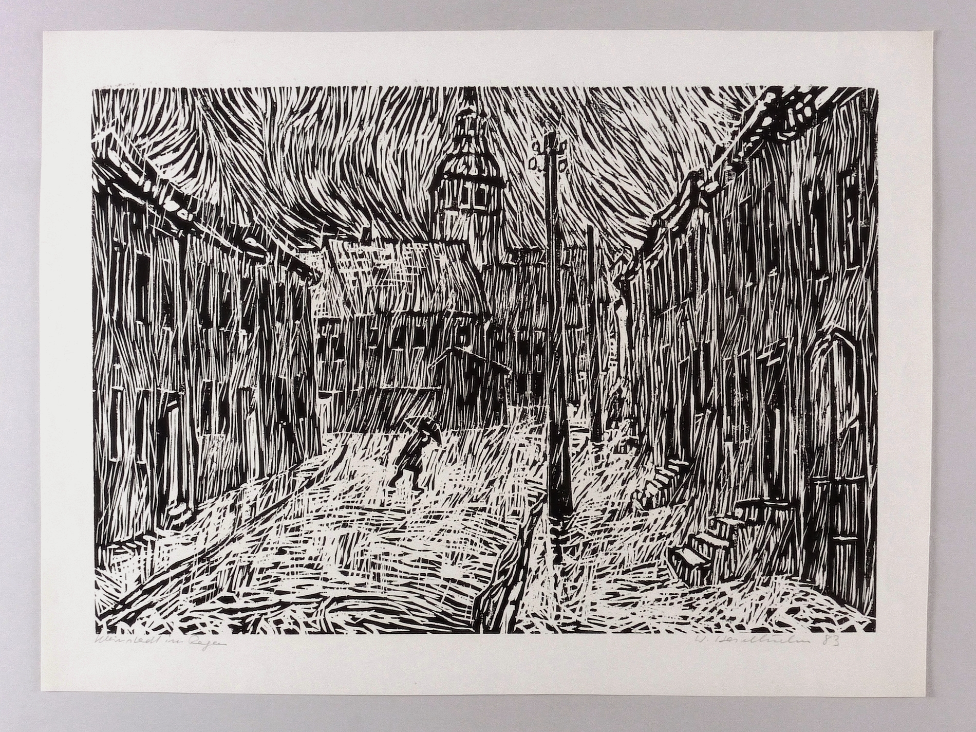 1983. Holzschnitt, in Schwarz, auf hellgelbem Velin. – Originale Künstlergrafik, von Werner Haselhuhn. – 46,2 x 66,4 cm (Darstellung / Druckbild), 56 x 75 cm (Blatt).