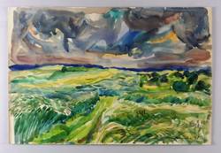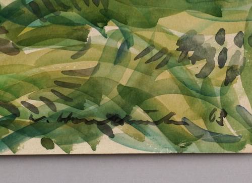 Rechts unten mit Pinsel signiert und datiert: ″W. Haselhuhn 68″. Verso zweimal in Bleistift und Kugelschreiber betitelt: ″Grüne Kornfelder mit Regenhimmel // Grüne Kornfelder im Wind″. – Umlaufend leichte Randmängel. Mäßig guter Zustand.