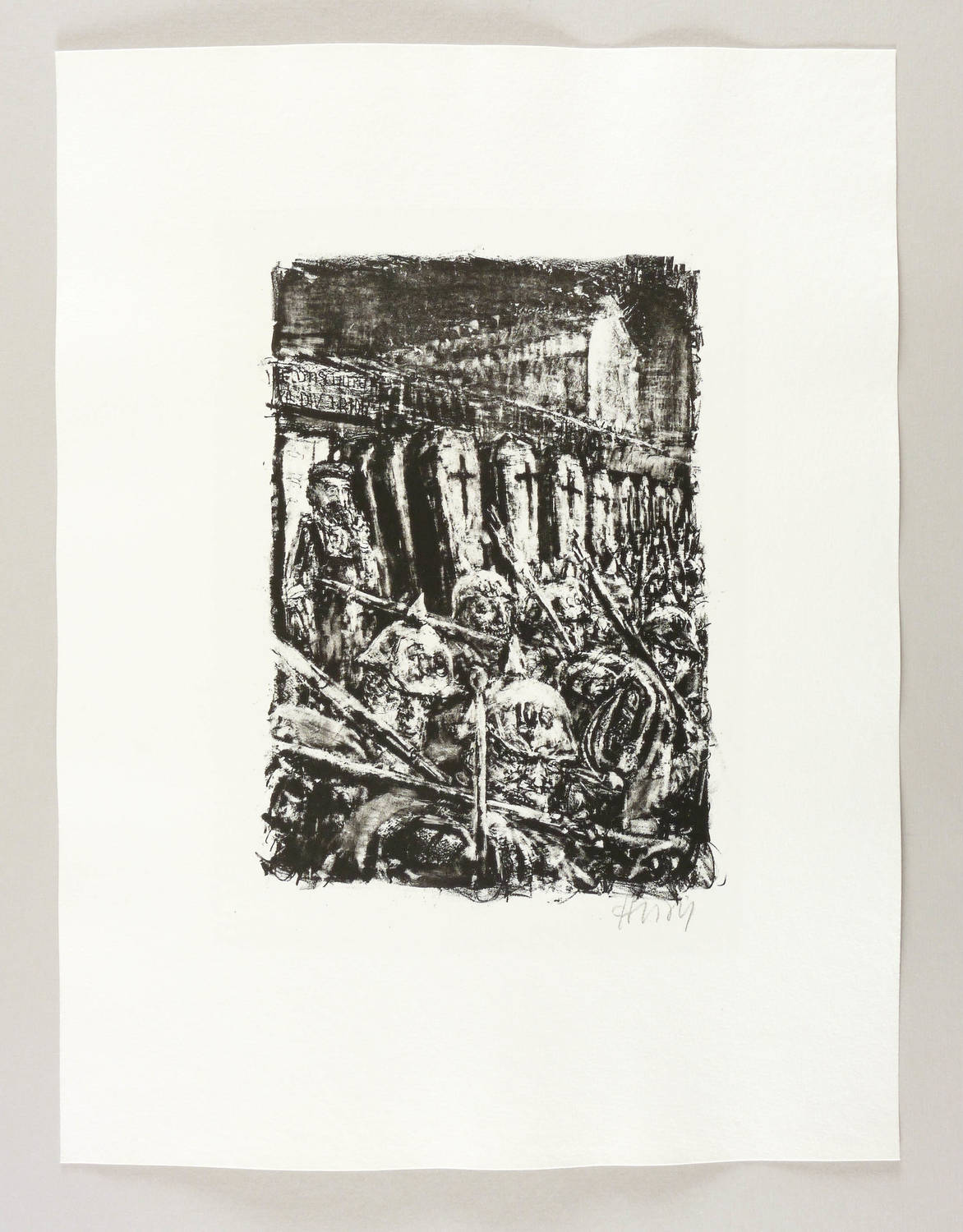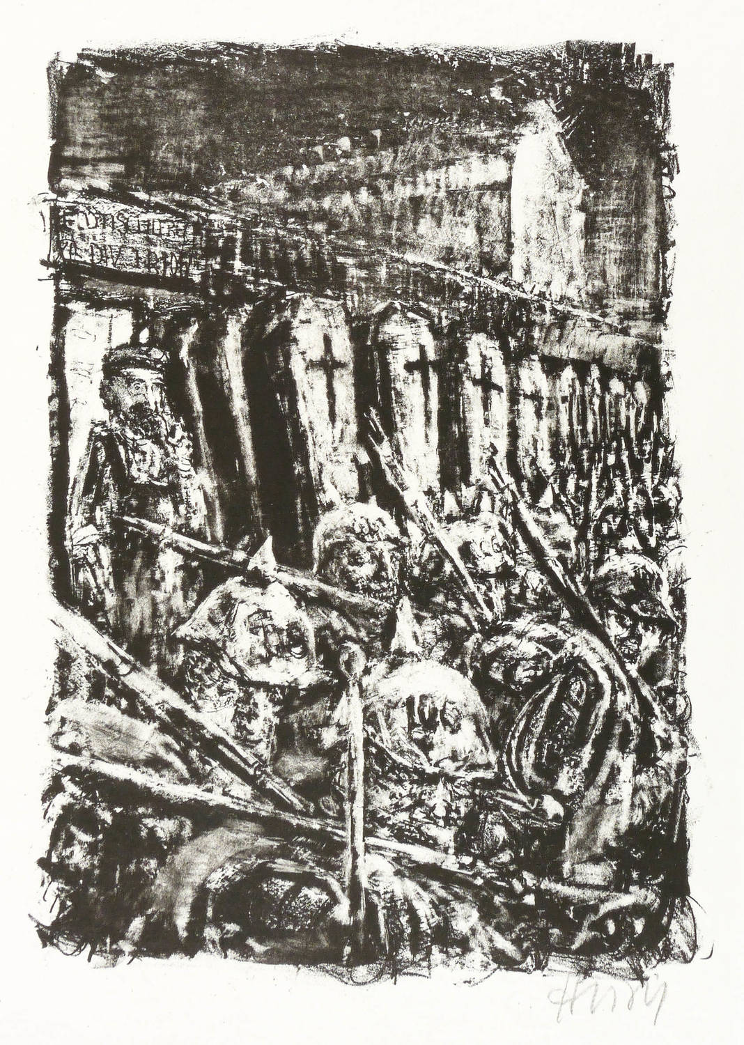 Aus: Bernhard Heisig, 24 Lithografien zu Ludwig Renns Roman Krieg. Grafik Edition V (Leipzig: Philipp Reclam jun. 1979). – Rechts unten in Bleistift signiert: ″Heisig″. – Druck von Horst Arloth, Leipzig. - Aus der 1976-78 lithografierten Folge nach Ludwig Renn's Roman zum Ersten Weltkrieg, 1979 herausgegeben in der ″Grafik Edition″ von Lothar Lang und Hans Marquardt. – Tadellos erhalten. Ohne Mängel. Sehr guter Zustand.