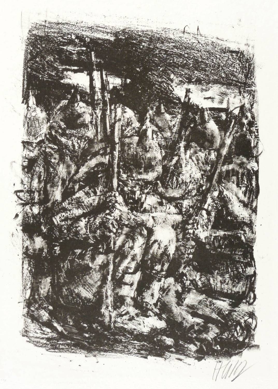 Aus: Bernhard Heisig, 24 Lithografien zu Ludwig Renns Roman Krieg. Grafik Edition V (Leipzig: Philipp Reclam jun. 1979). – Rechts unten in Bleistift signiert: ″Heisig″. – Druck von Horst Arloth, Leipzig. - Aus der 1976-78 lithografierten Folge nach Ludwig Renn's Roman zum Ersten Weltkrieg, 1979 herausgegeben in der ″Grafik Edition″ von Lothar Lang und Hans Marquardt. – Tadellos erhalten. Ohne Mängel. Sehr guter Zustand.