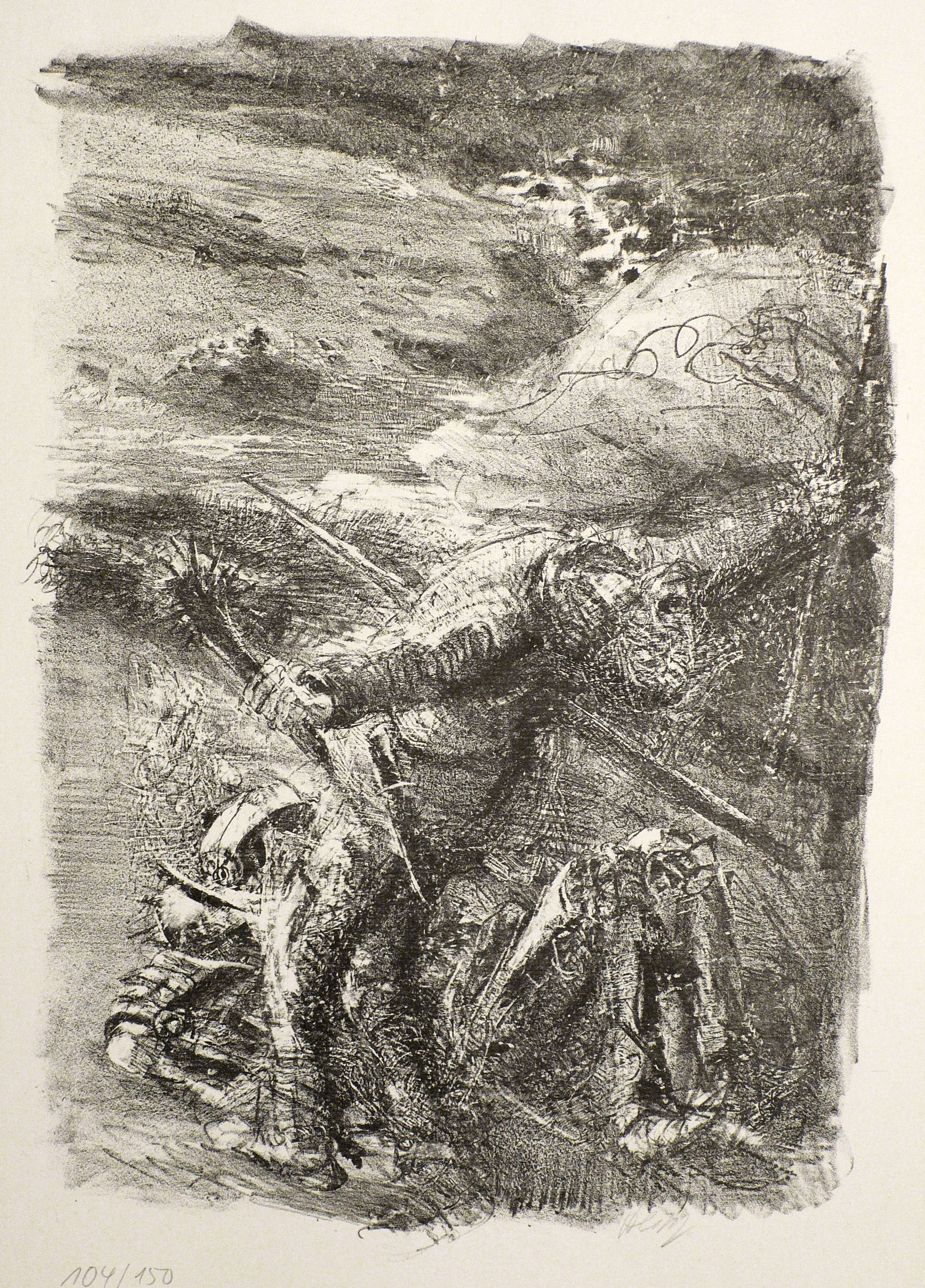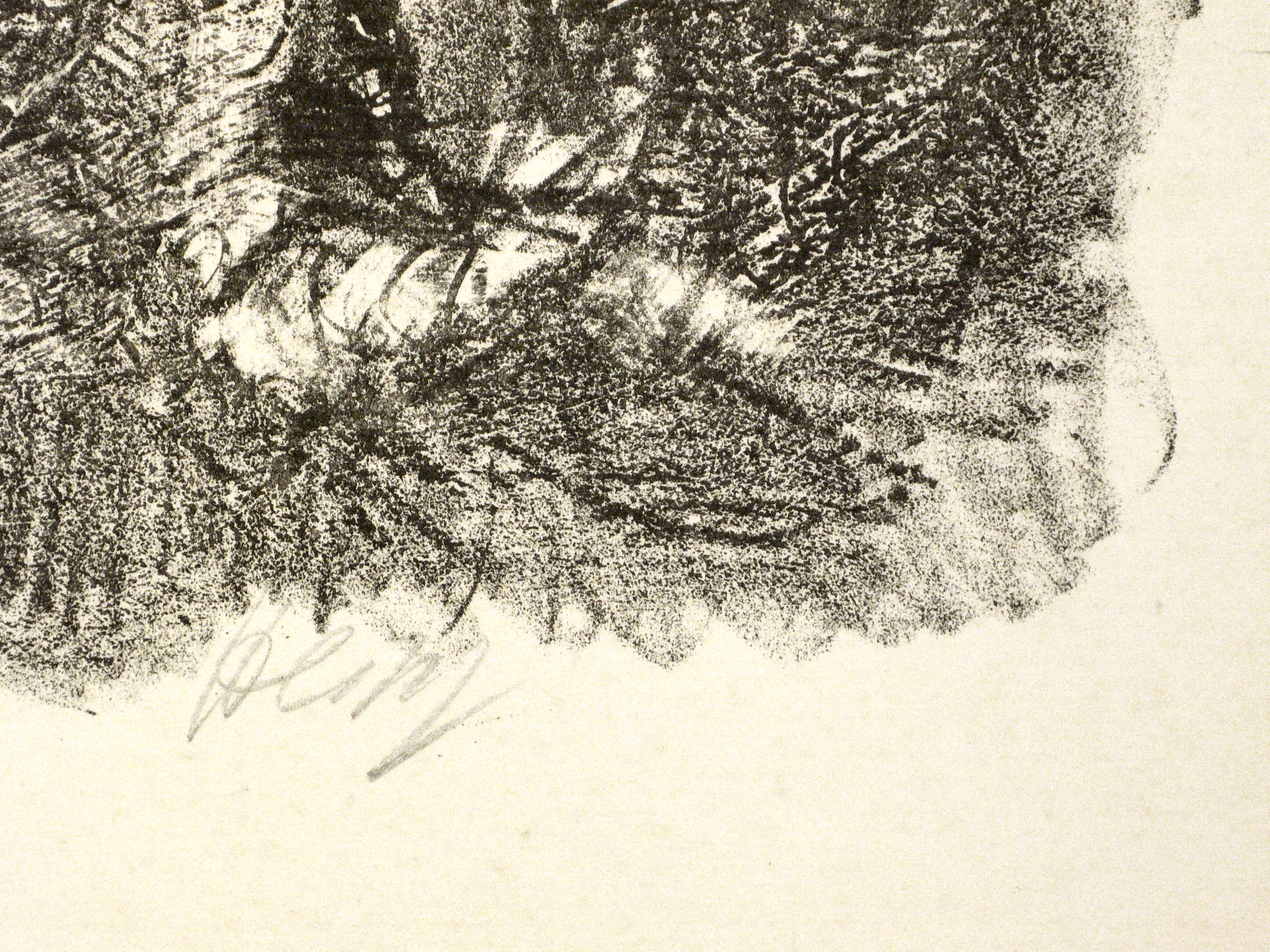 1975. Lithografie / Kreidelithografie, partiell geschabt, in Schwarz, auf hellchamois Maschinenpapier. – Originale Künstlergrafik, von Bernhard Heisig. – Auflage Exemplar Nr. 104/150. – 43,0 x 30,0 cm (Darstellung / Druckbild), 50 x 35 cm (Blatt).