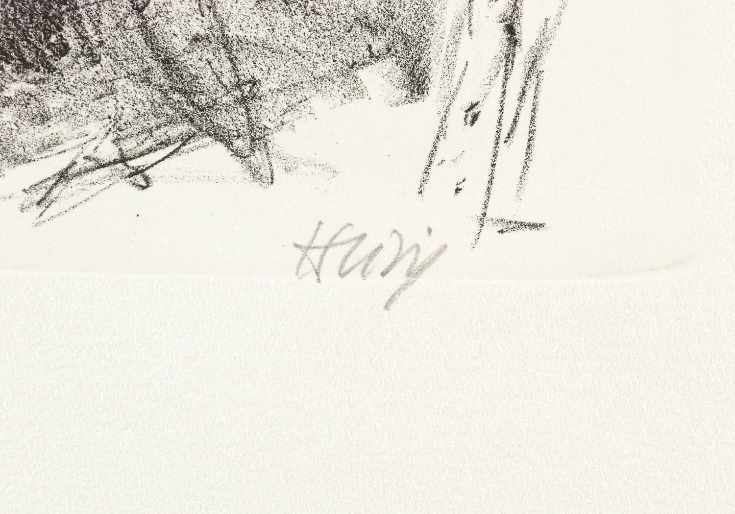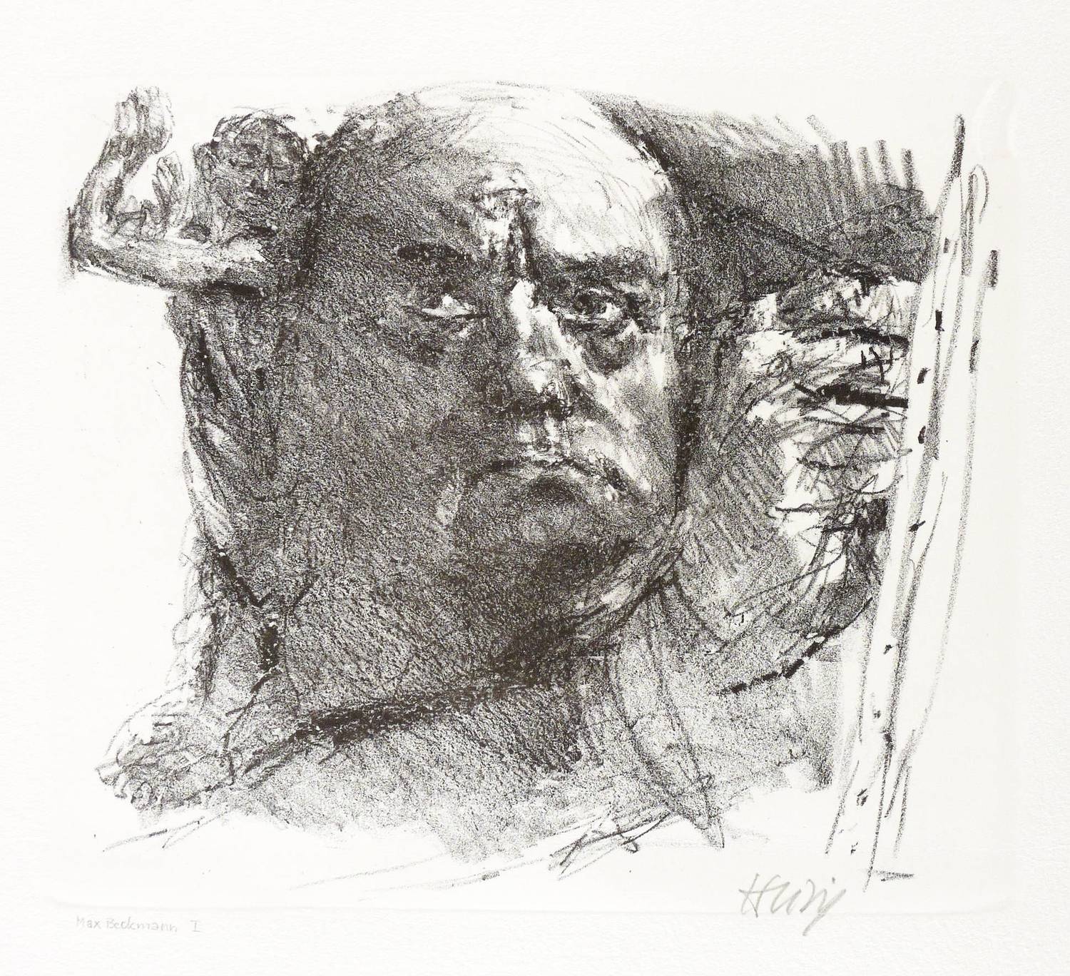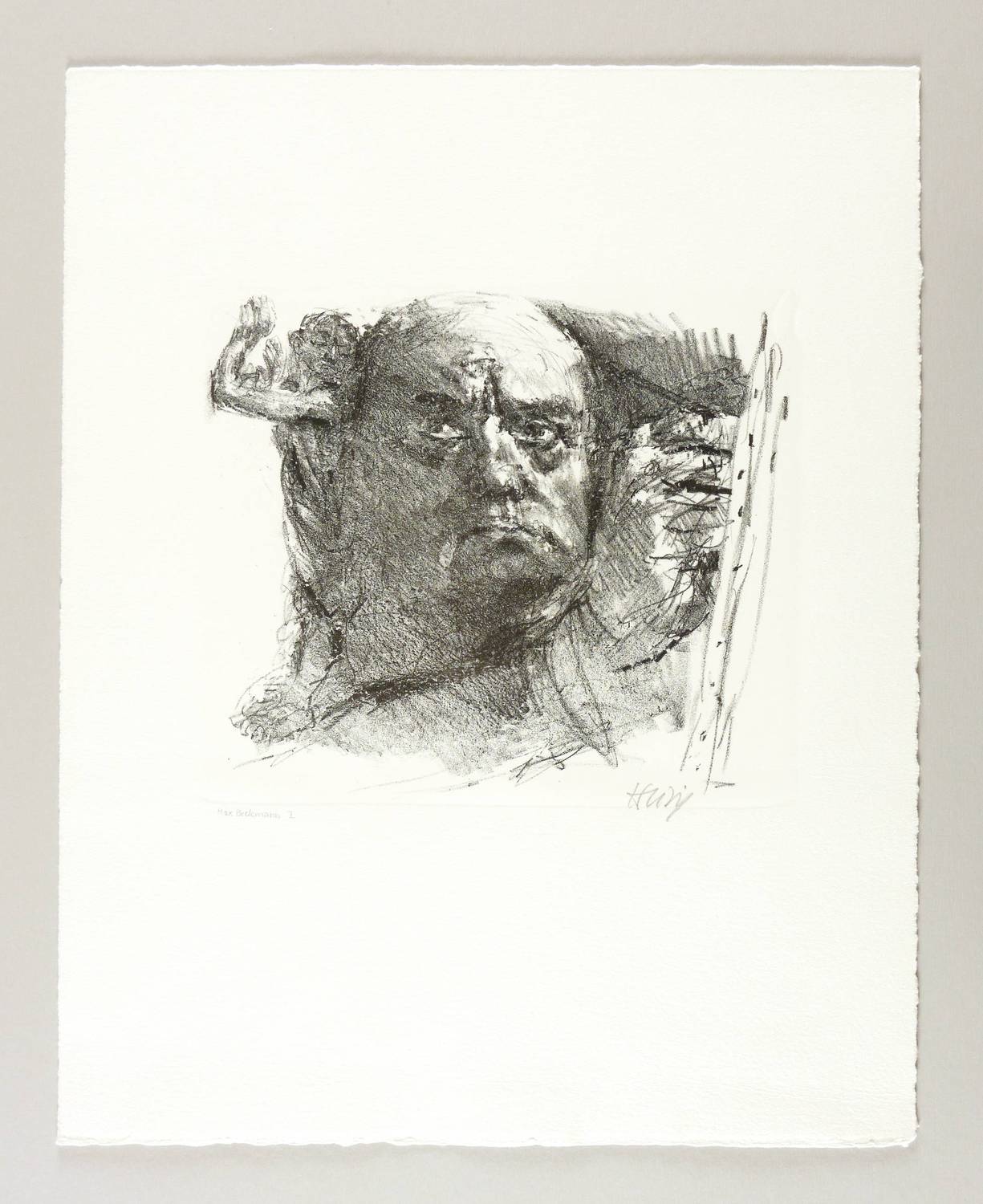 Rechts unten in Bleistift signiert. Links Titel: ″Max Beckmann I″. – Etwas kleinere und kompositorisch dichter aufgefasste Variante zur Lithografie ″Max Beckmann″ (1983, 30,5 x 36,5 cm). Irreführend im Titel als Variante I bezeichnet. – Schönes unbeschnittenes Exemplar. Ohne Tadel. Sehr guter Zustand.
