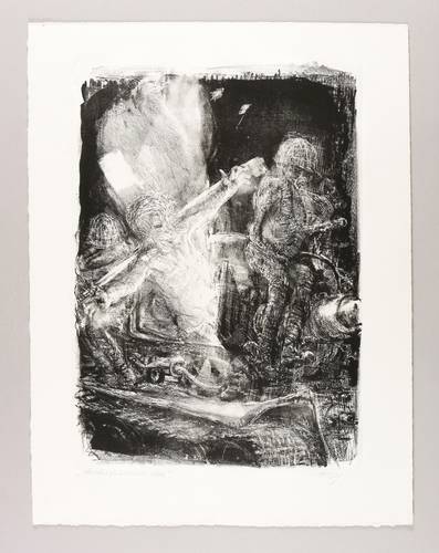 1974/1975. Lithografie / Kreide- & Pinsellithografie, geschabt, in Schwarz, auf schwerem hellchamois Hahnemühle. – Originale Künstlergrafik, von Bernhard Heisig. – 52,5 x 37,5 cm (Darstellung / Stein), 65 x 49 cm (Blatt).