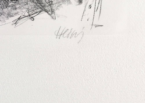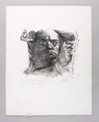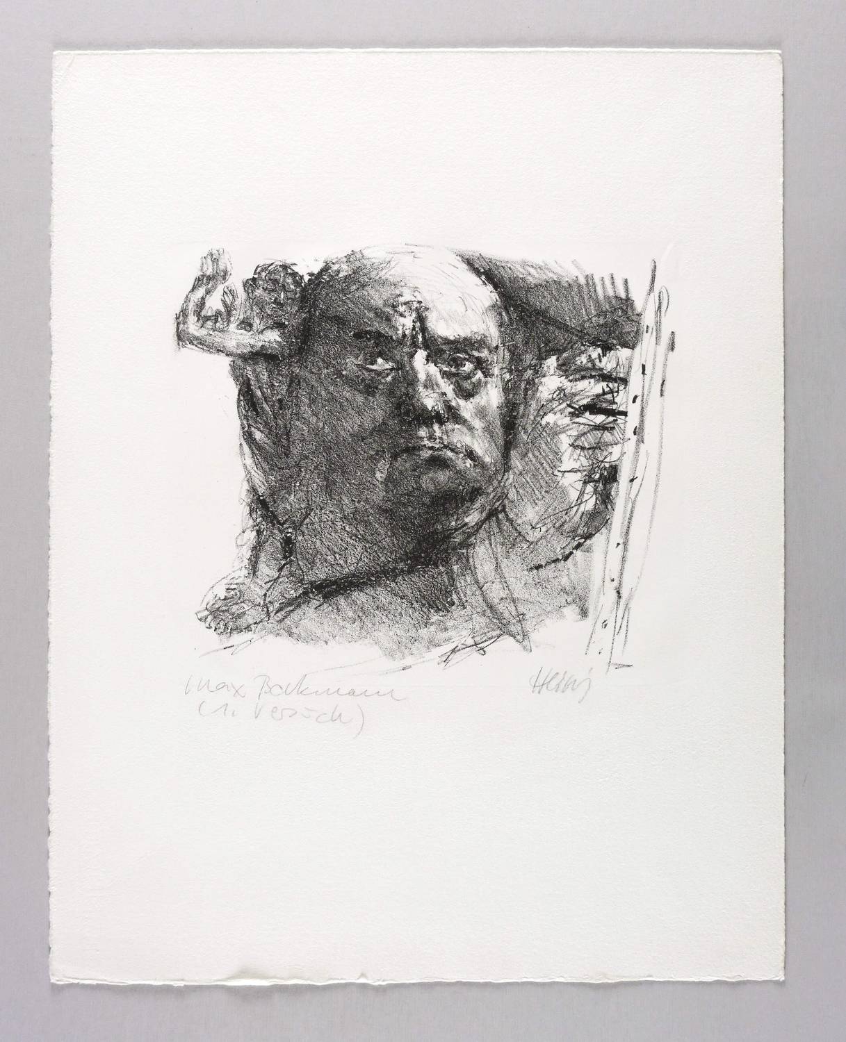Rechts unten in Bleistift signiert: ″Heisig″. Links Titel: ″Max Beckmann″. Dazu bezeichnet: ″(1. Versuch)″. Wasserzeichen der Hahnemühle. – Etwas kleinere und kompositorisch dichter aufgefasste Variante zur Lithografie ″Max Beckmann″ (1983, 30,5 x 36,5 cm). - Hier ein erster Probedruck. – Gutes Exemplar. Die Blattecken bisweilen leicht bestoßen. Guter Zustand.