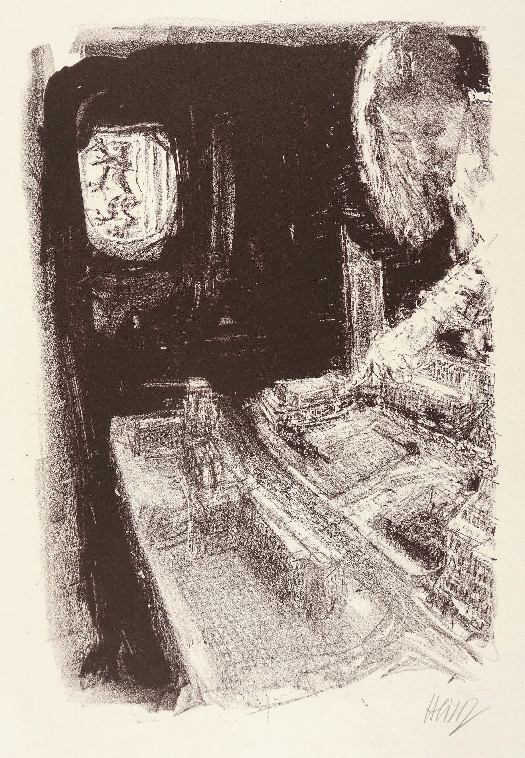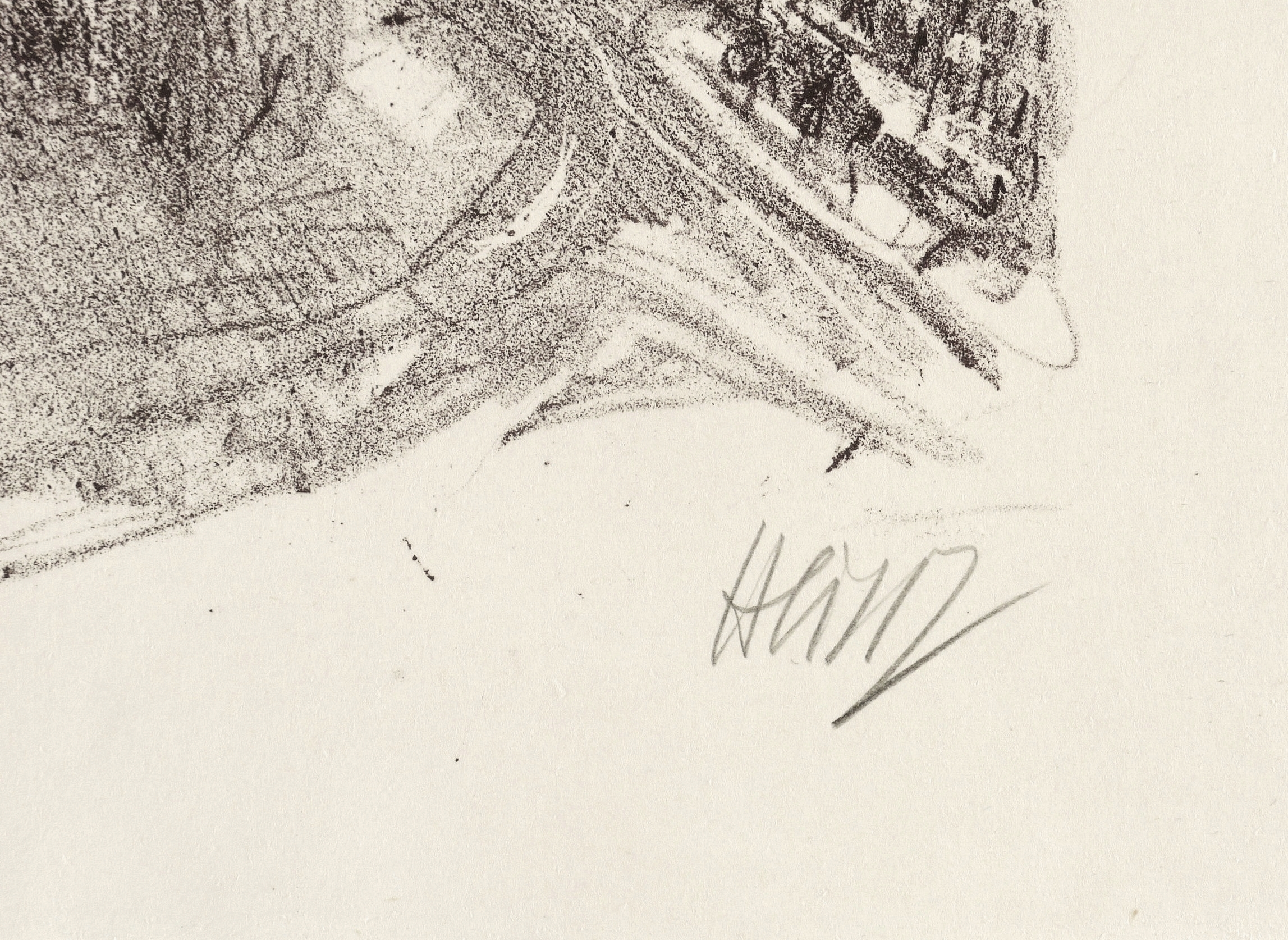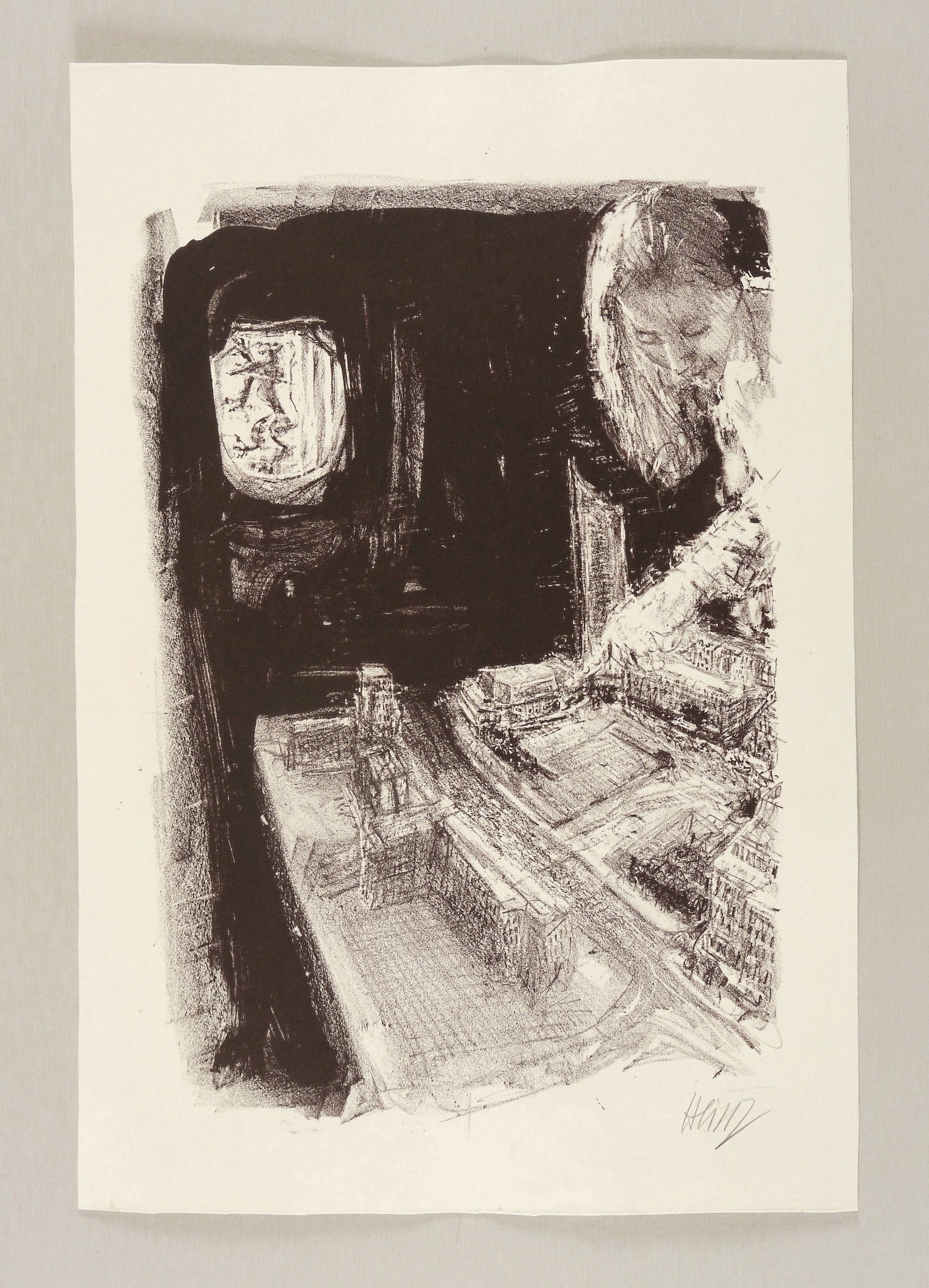 Um 1980. Lithografie / Kreide- & Pinsellithografie, partiell geschabt, in Schwarzrot, auf hellchamois Kupferdruck. – Originale Künstlergrafik, von Bernhard Heisig. – 30,6 x 21,0 cm (Darstellung / Druckbild), 37 x 25 cm (Blatt).