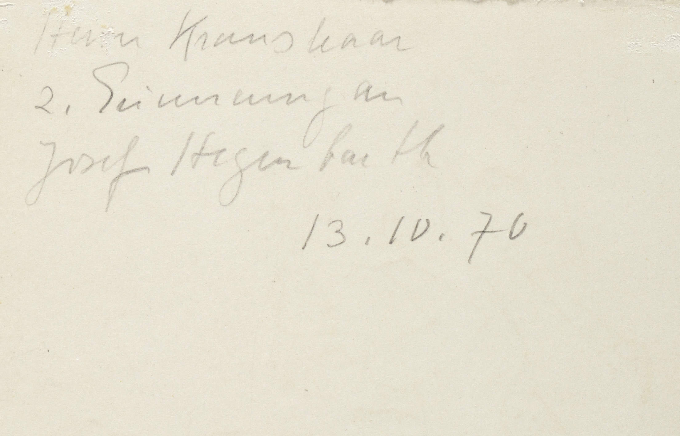 Zesch F IV 672. – Verso in Bleistift Widmung und Signatur: ″Herrn Kraushaar z. Erinnerung an Josef Hegenbarth″. Dazu weitere diverse Notationen in Bleistift. – Sehr guter Zustand.