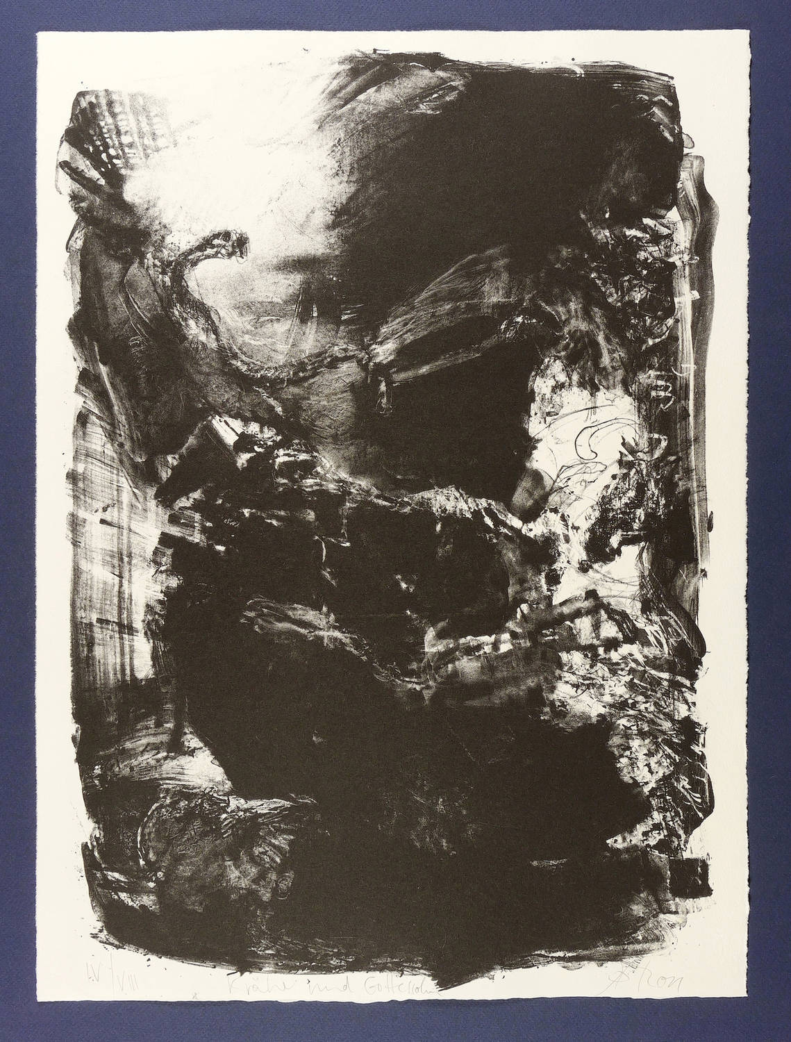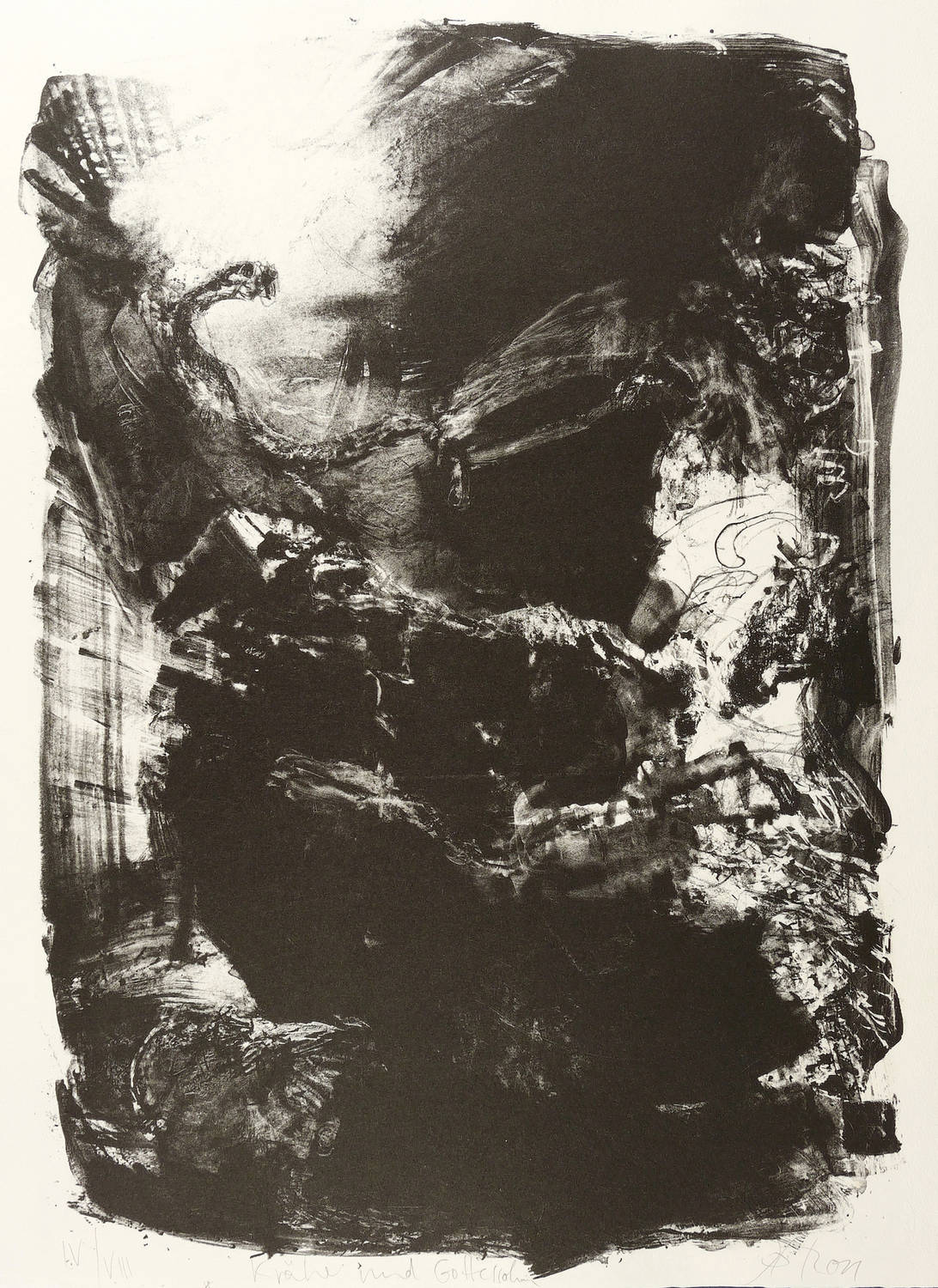 Rechts unten in Bleistift signiert und datiert. Links Auflagenbezeichnung und Titel. – Zum Gedichtband ″Crow. From the Life and the Songs of the Crow″ (1970) des englischen Dichters Ted Hughes. - Herausragendes druckgrafisches Werk von Johannes Heisig. – Sehr guter Zustand. Ohne Mangel.