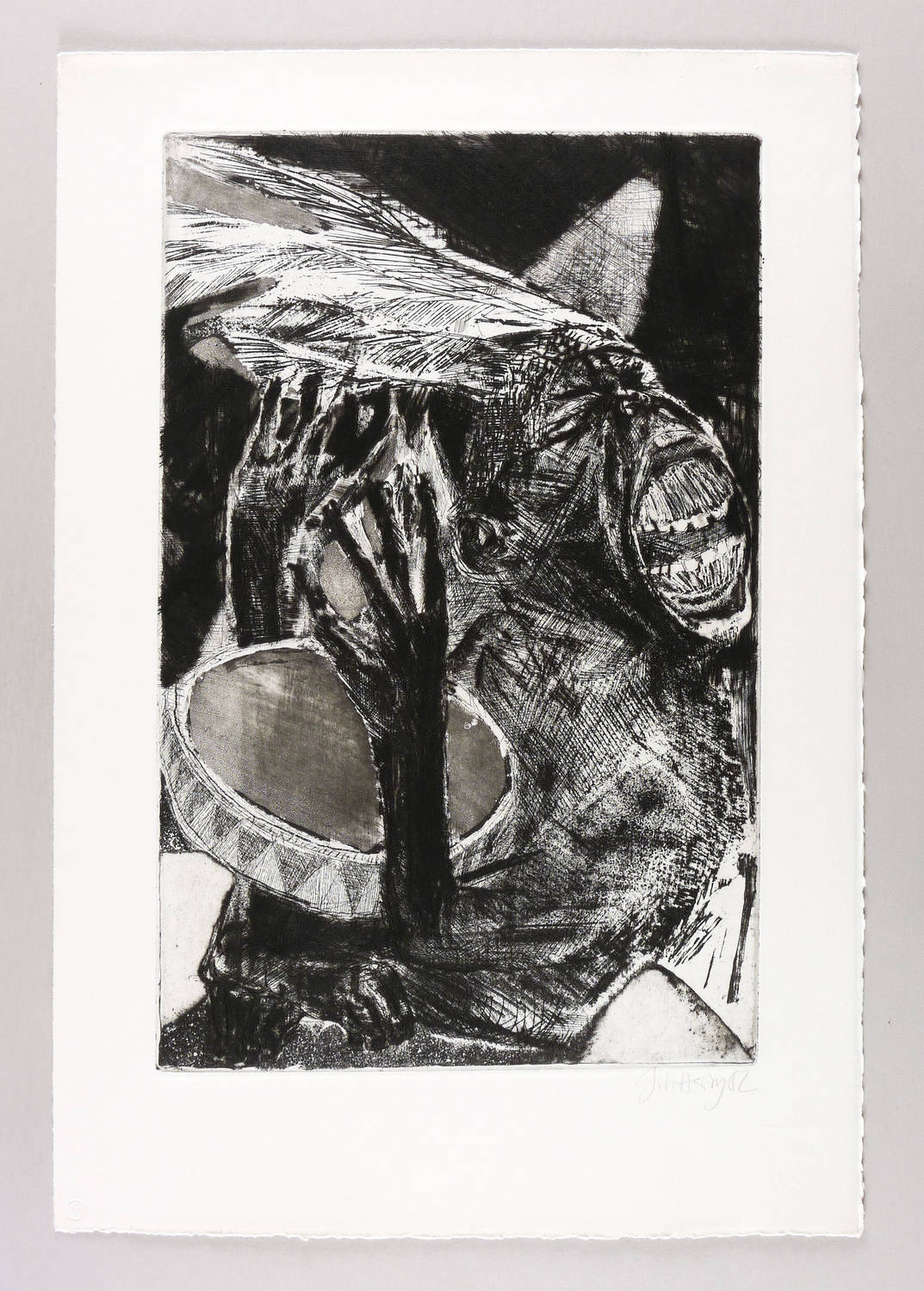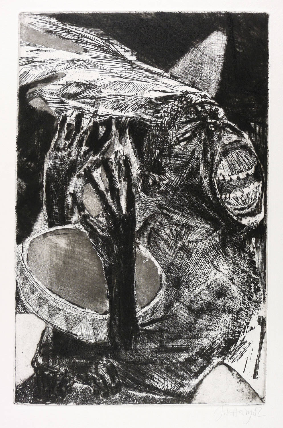 1982. Radierung / Vernis mou, Aquatinta & Strichätzung, in Schwarz, auf hellchamois Hahnemühle-Bütten. – Originale Künstlergrafik, von Johannes Heisig. – 50,2 x 32,2 cm (Darstellung / Platte), 64 x 44 cm (Blatt).