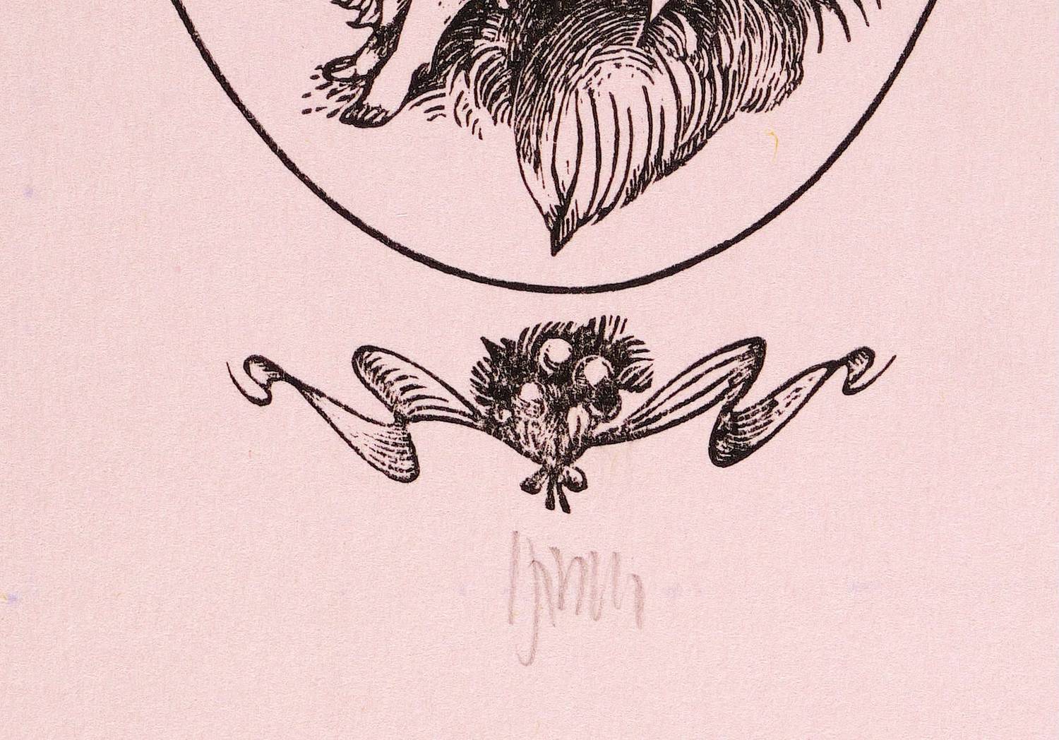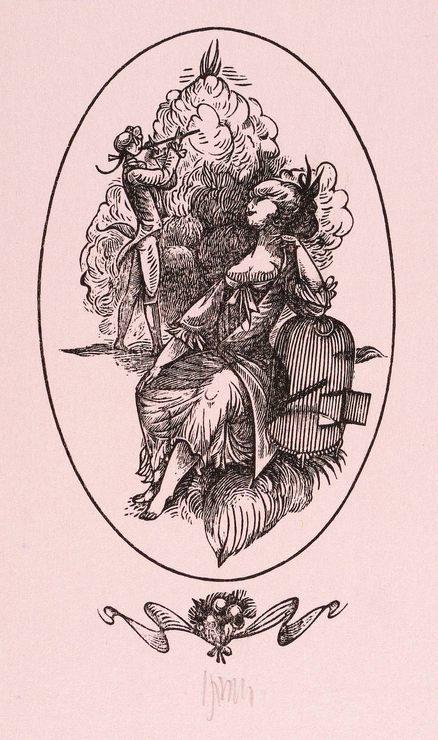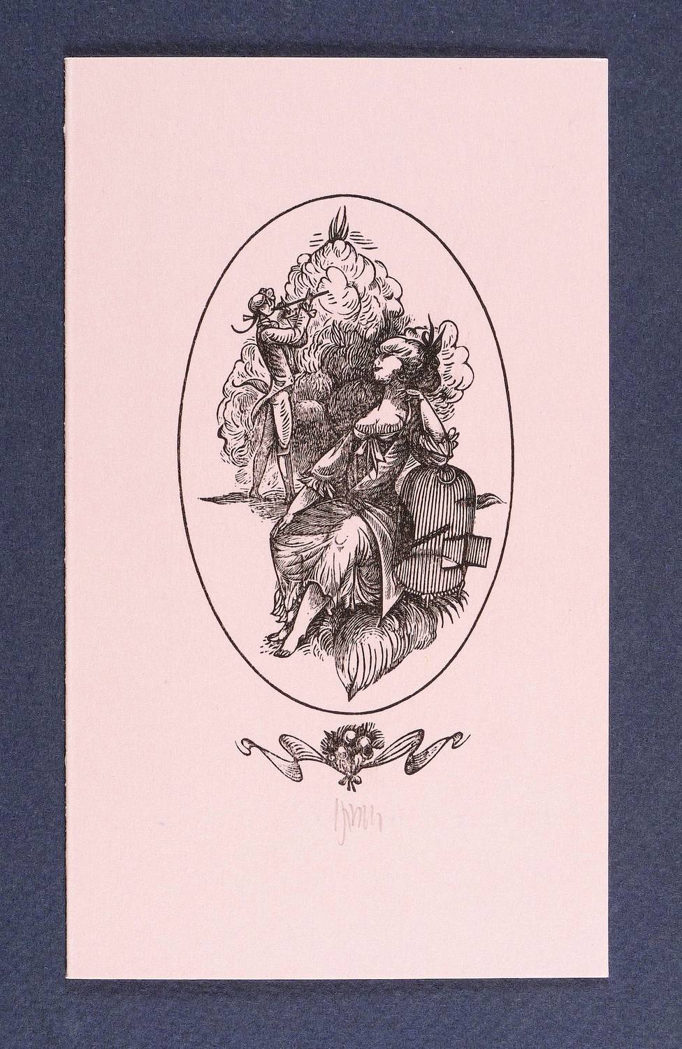 1970. Holzstich, in Schwarz, auf hellrosa Karton. – Originale Künstlergrafik, von Karl-Georg Hirsch. – 9,4 x 5,3 cm (Darstellung / Druckbild), 15 x 9 cm (Blatt).