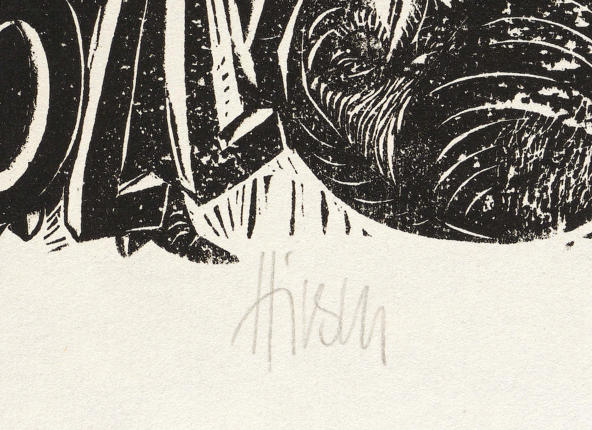 Karl-Georg Hirsch (*1938 Breslau, lebt und arbeitet bei Leipzig). Deutscher Grafiker. Lehre und Tätigkeit als Stuckateur. 1960-65 Studium an der Hochschule für Grafik und Buchkunst Leipzig (HGB). Ab 1965 freischaffend. 1967–70 Assistent an der HGB, seit 1970 Leiter der Werkstatt Holzschnitt, seit 1976 Dozent ebenda. 1981/82 Gastdozent für Holzschnitt und Holzstich an der finnischen Universität Jyväskylä. 1989 Berufung zum Professor für Grafik und Illustration an der HGB. 1990-97 Prorektor. Bekannt für seinen miniaturhaften, meisterhaft virtuosen Holzschnitt, den man in der DDR ob seiner extremen Schärfe und Kleinteiligkeit unrichtig als Holzstich bezeichnete.