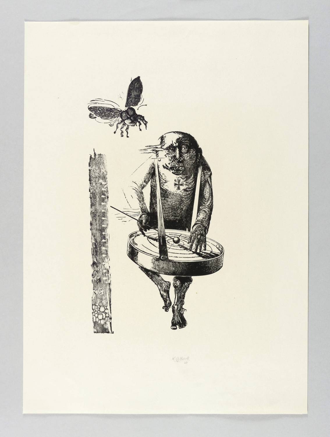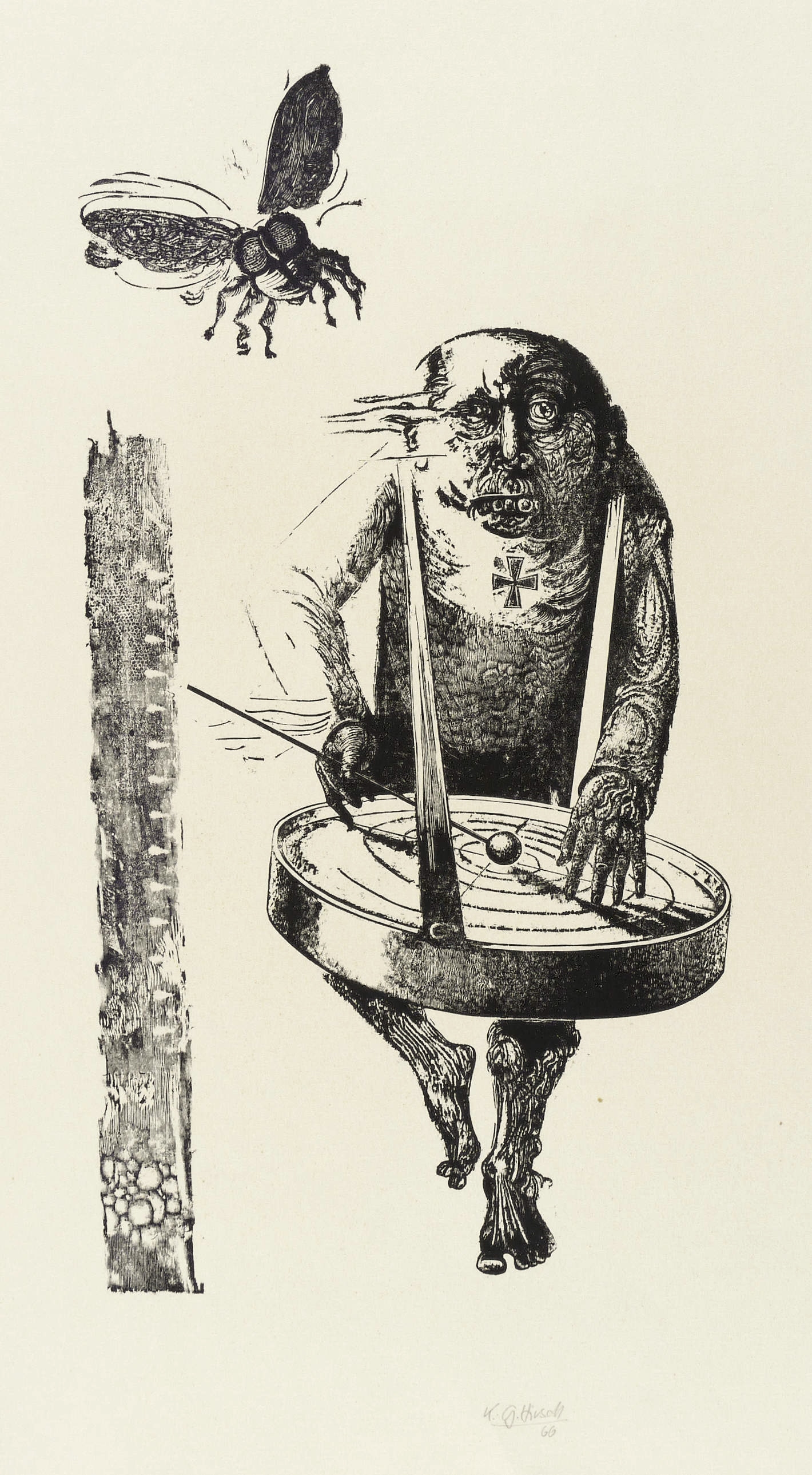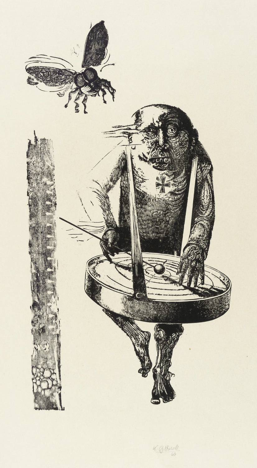 Karl-Georg Hirsch (*1938 Breslau, lebt und arbeitet bei Leipzig). Deutscher Grafiker. Lehre und Tätigkeit als Stuckateur. 1960-65 Studium an der Hochschule für Grafik und Buchkunst Leipzig (HGB). Ab 1965 freischaffend. 1967–70 Assistent an der HGB, seit 1970 Leiter der Werkstatt Holzschnitt, seit 1976 Dozent ebenda. 1981/82 Gastdozent für Holzschnitt und Holzstich an der finnischen Universität Jyväskylä. 1989 Berufung zum Professor für Grafik und Illustration an der HGB. 1990-97 Prorektor. Bekannt für seinen miniaturhaften, meisterhaft virtuosen Holzschnitt, den man in der DDR ob seiner extremen Schärfe und Kleinteiligkeit unrichtig als Holzstich bezeichnete.