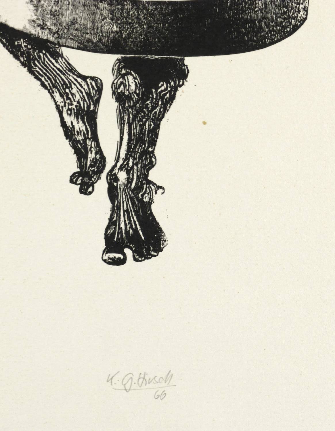 1966. Holzschnitt, in Schwarz, auf hellgelbem Achat-Maschinenbütten. – Originale Künstlergrafik, von Karl-Georg Hirsch. – 34,7 x 18,0 cm (Darstellung / Druckbild), 54 x 39 cm (Blatt).