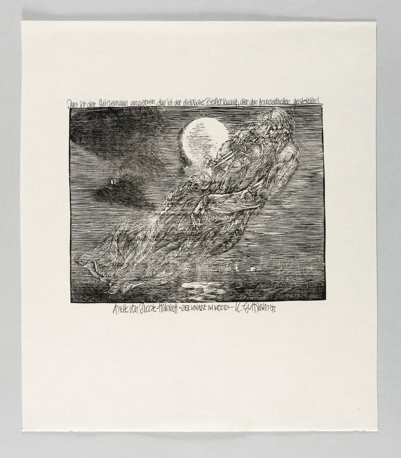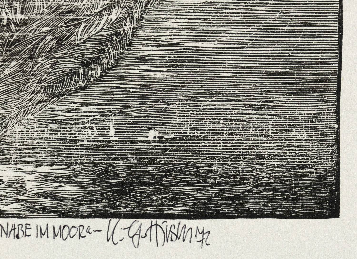 1972. Holzschnitt, in Schwarz, auf rauem weißlichem Maschinenpapier. – Originale Künstlergrafik, von Karl-Georg Hirsch. – 18,2 x 23,6 cm (Darstellung / Druckbild), 38 x 33 cm (Blatt).