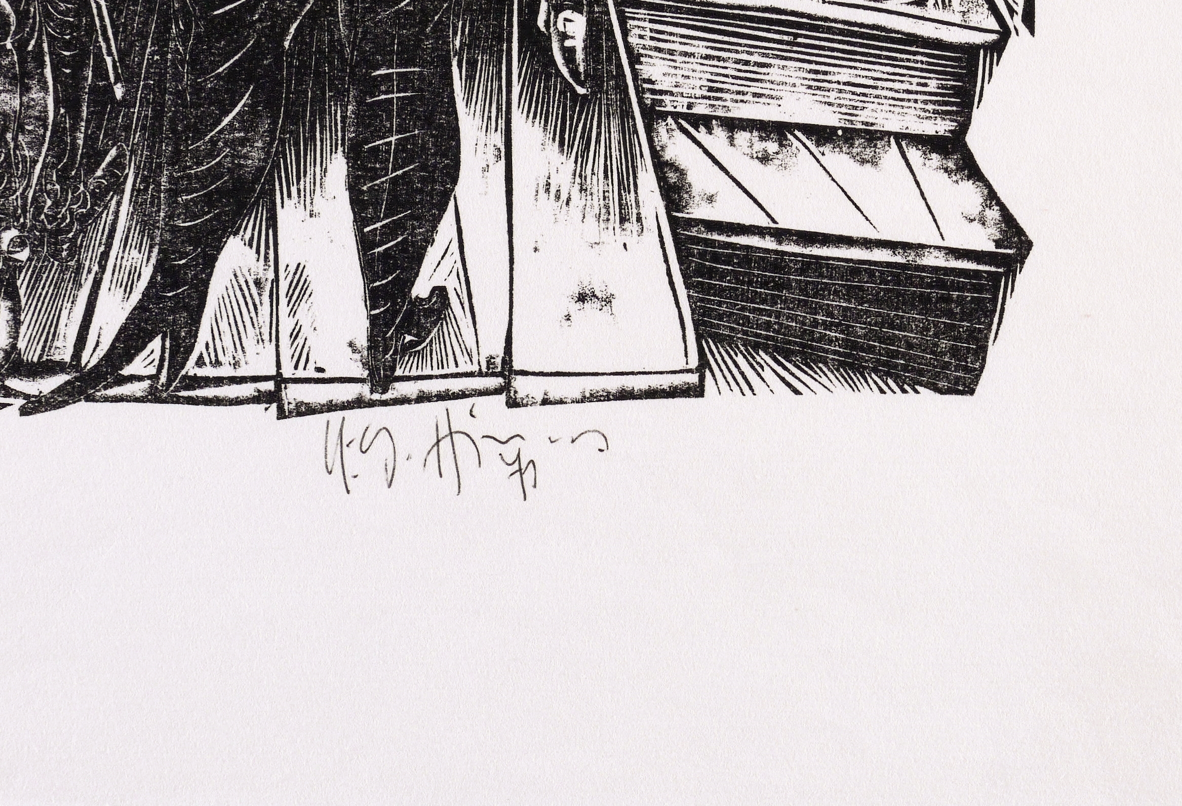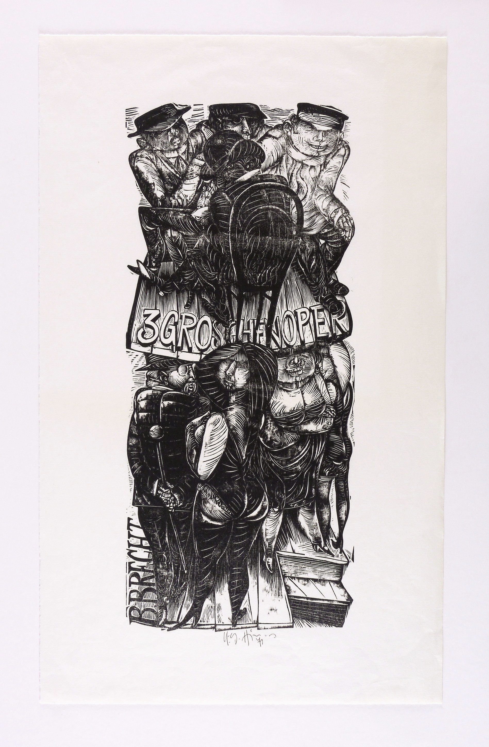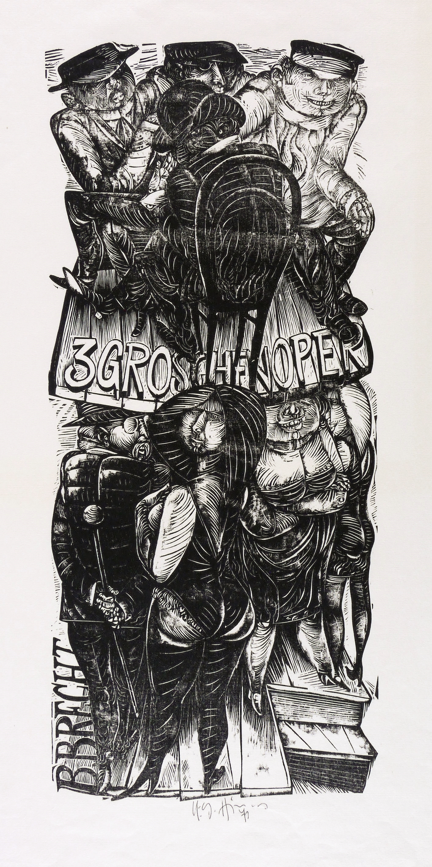 Aus: Karl-Georg Hirsch, Die Dreigroschenoper. 10 Holzschnitte (Leipzig: 1971). – Unterhalb in Kugelschreiber signiert und datiert: ″H.G. Hirsch 71″. Im Druckstock Inschrift: ″3GROSCHENOPER // BRECHT″. – Papier in den Rändern mit leichten Griffspuren. Guter Zustand.