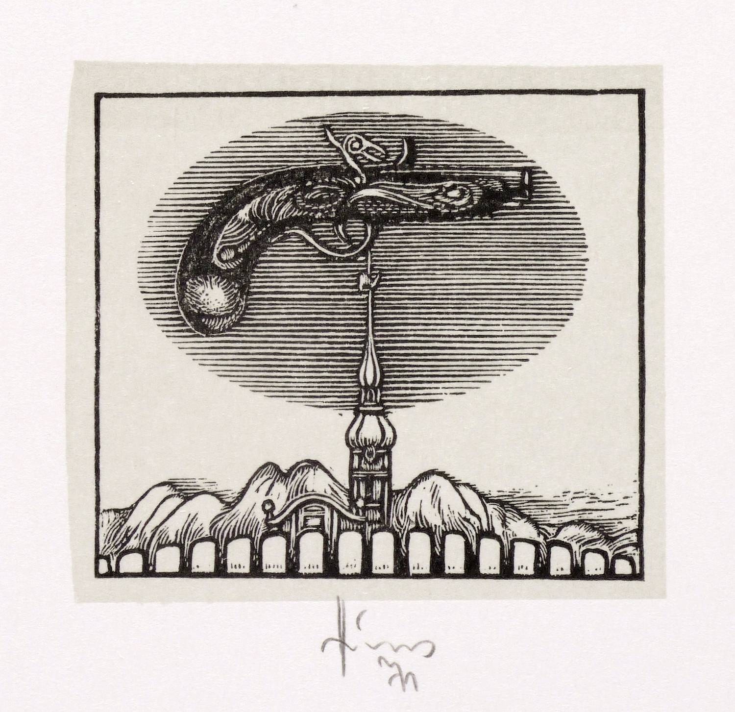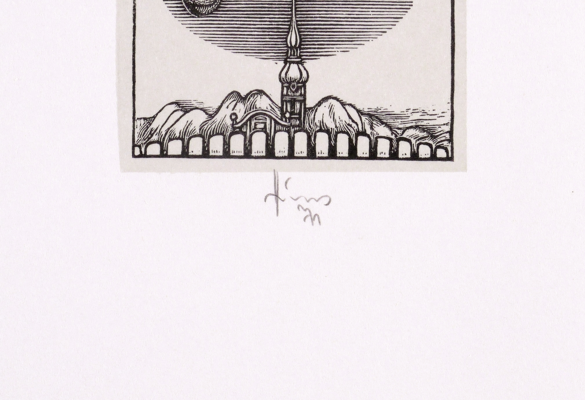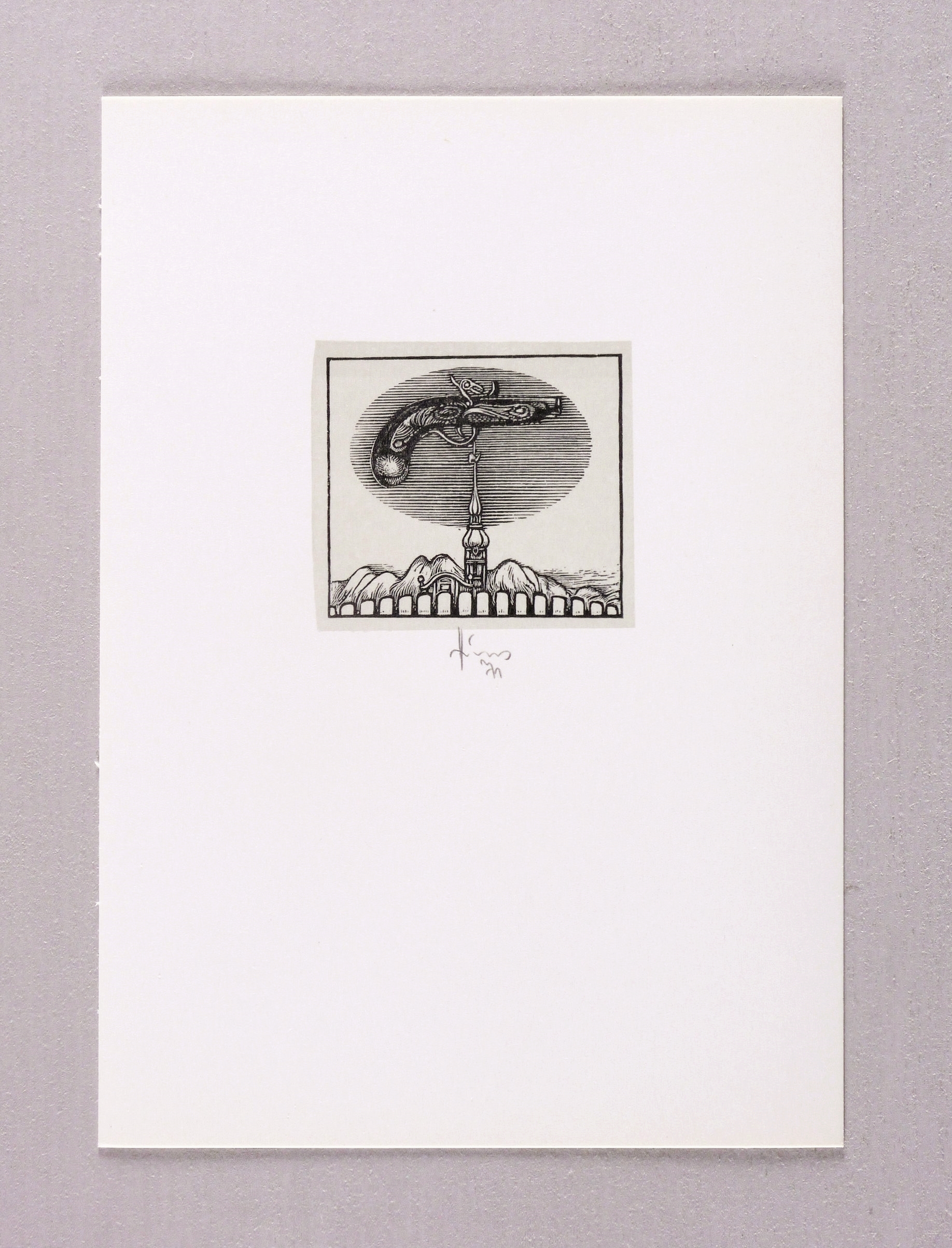 1971. Holzschnitt, in Schwarz, über beigefarbener Tonplatte, auf weißem Karton. – Originale Künstlergrafik, von Karl-Georg Hirsch. – 3,7 x 4,2 cm (Darstellung / Druckbild), 15 x 11 cm (Blatt).