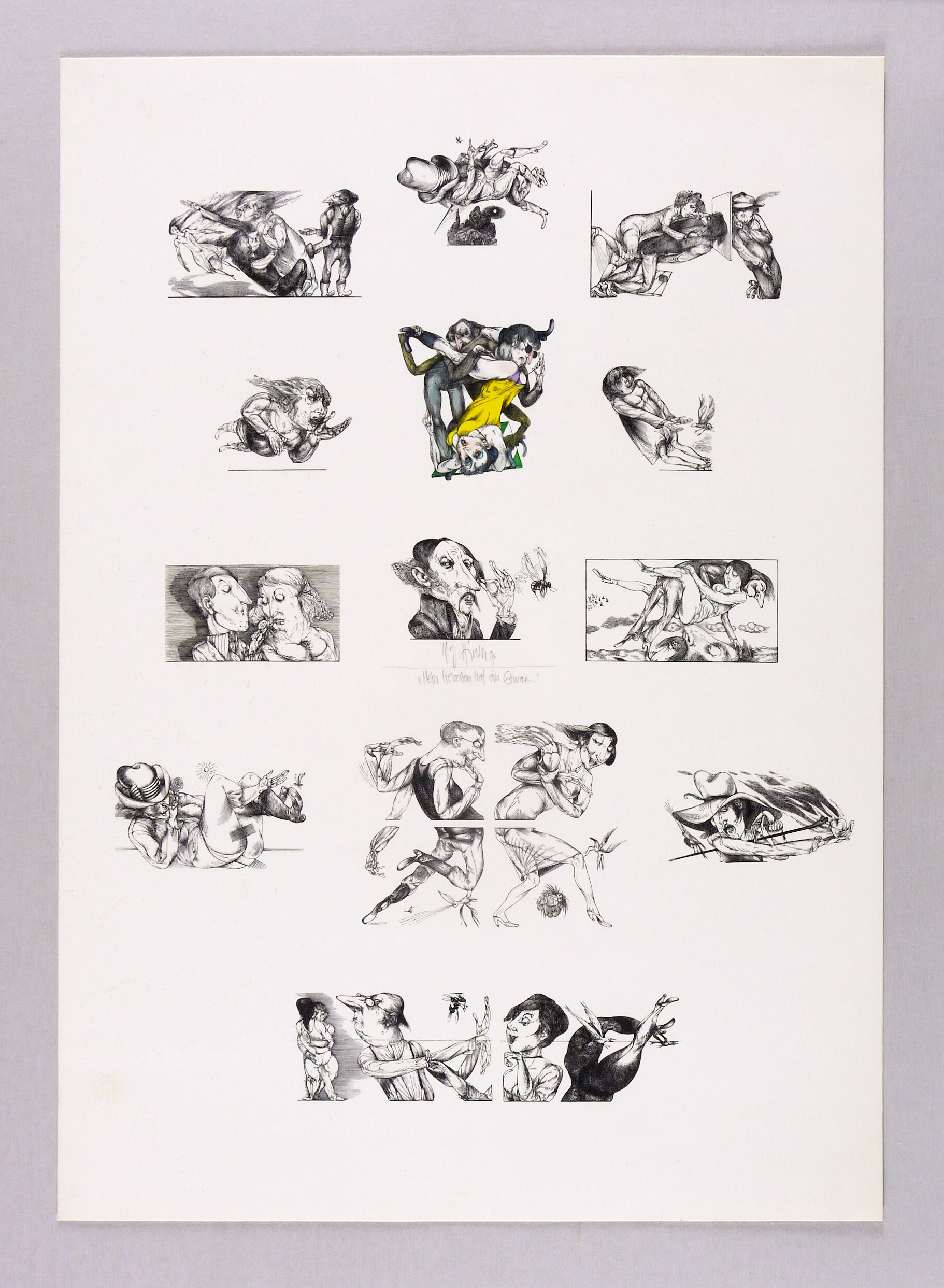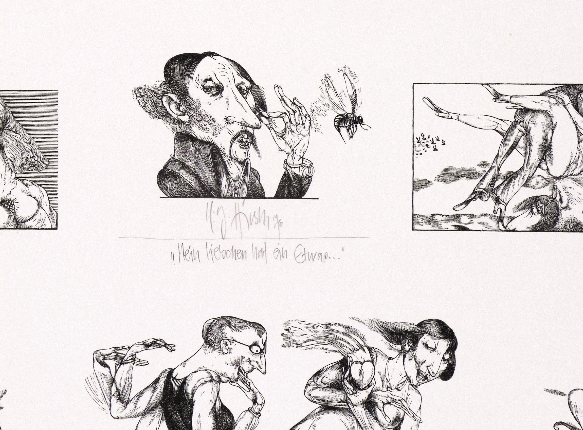 Im Zentrum der Darstellung in Bleistift signiert und datiert: ″K.-G. Hirsch 76″. Dazu Titel. Verso weiter eigenhändig bezeichnet: ″Am 3. II. 80 koloriert″. – Druck aus dem Jahr 1976, handkoloriert im Jahr 1980. – Zu dem gleichnamigen erotischen Volkslied: ″Mein Liebchen hat ein Etwas / Das ist so zart, so süß / Und dieses kleine Etwas / Das ist mein Paradies / Ich will es nicht behaupten / Daß sie allein es hat; / Es hat´s ein jedes Mädchen / Im Dorf und in der Stadt. // Die eine hat’s für viele / Die andre hat’s für sich / Da lob ich mir mein Mädchen, / Die hat es nur für mich / Und dieses kleine Etwas, / Das ist ihr Rosenmund, / Und wer was andres dachte / Das ist ein Schweinehund″. – Sehr guter Zustand.