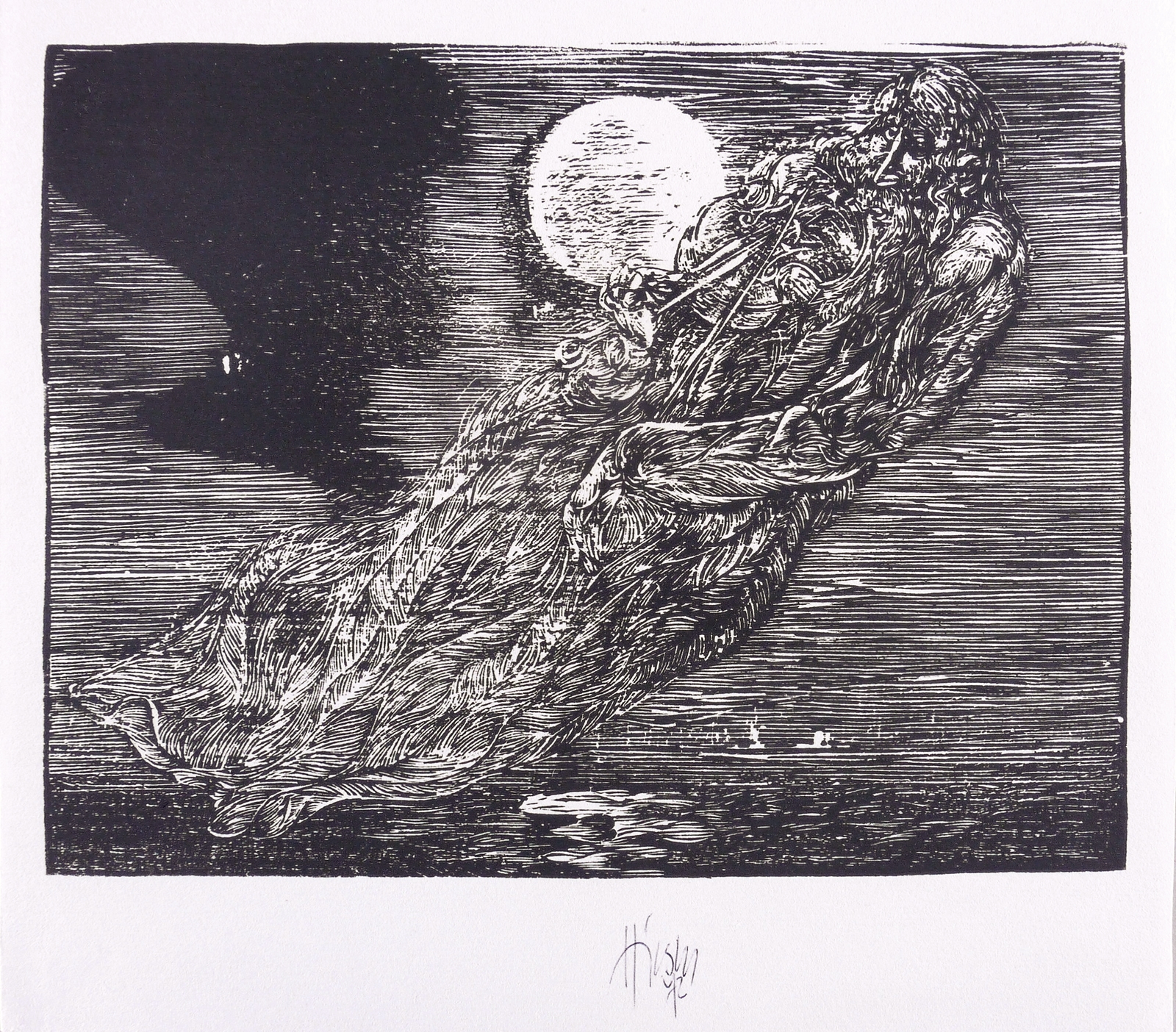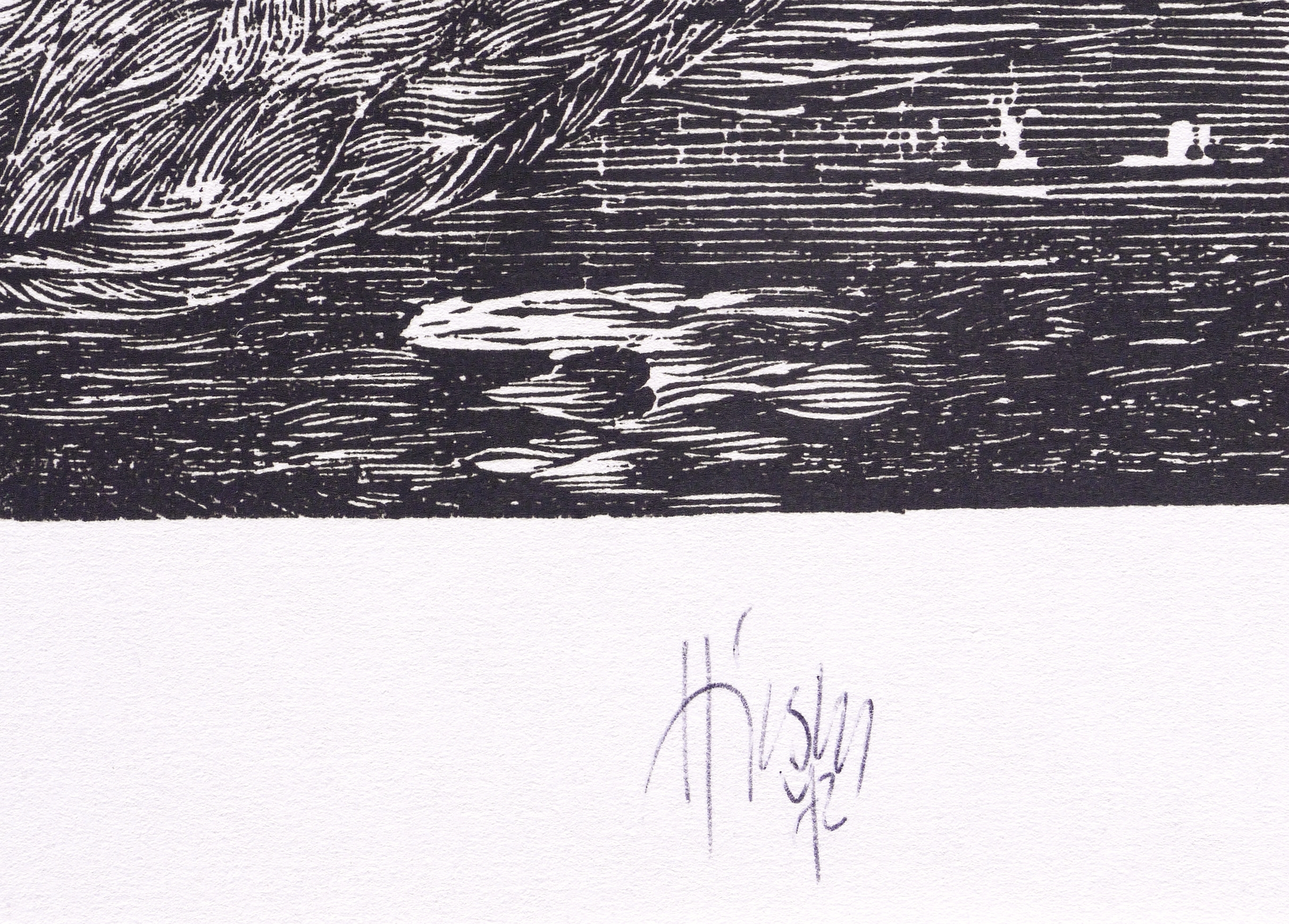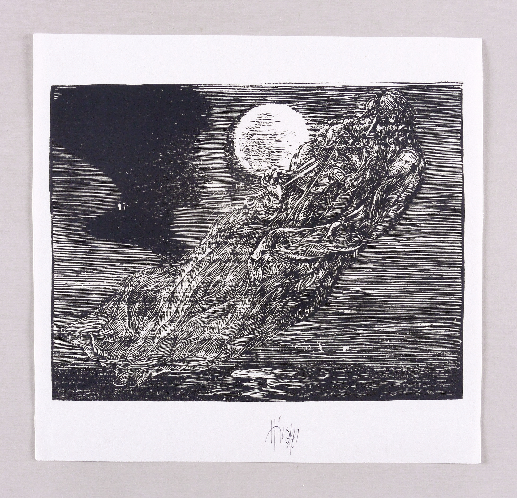 1972. Holzschnitt, in Schwarz, auf rauem weißlichem Maschinenpapier. – Originale Künstlergrafik, von Karl-Georg Hirsch. – 18,2 x 23,6 cm (Darstellung / Druckbild), 25 x 26 cm (Blatt).